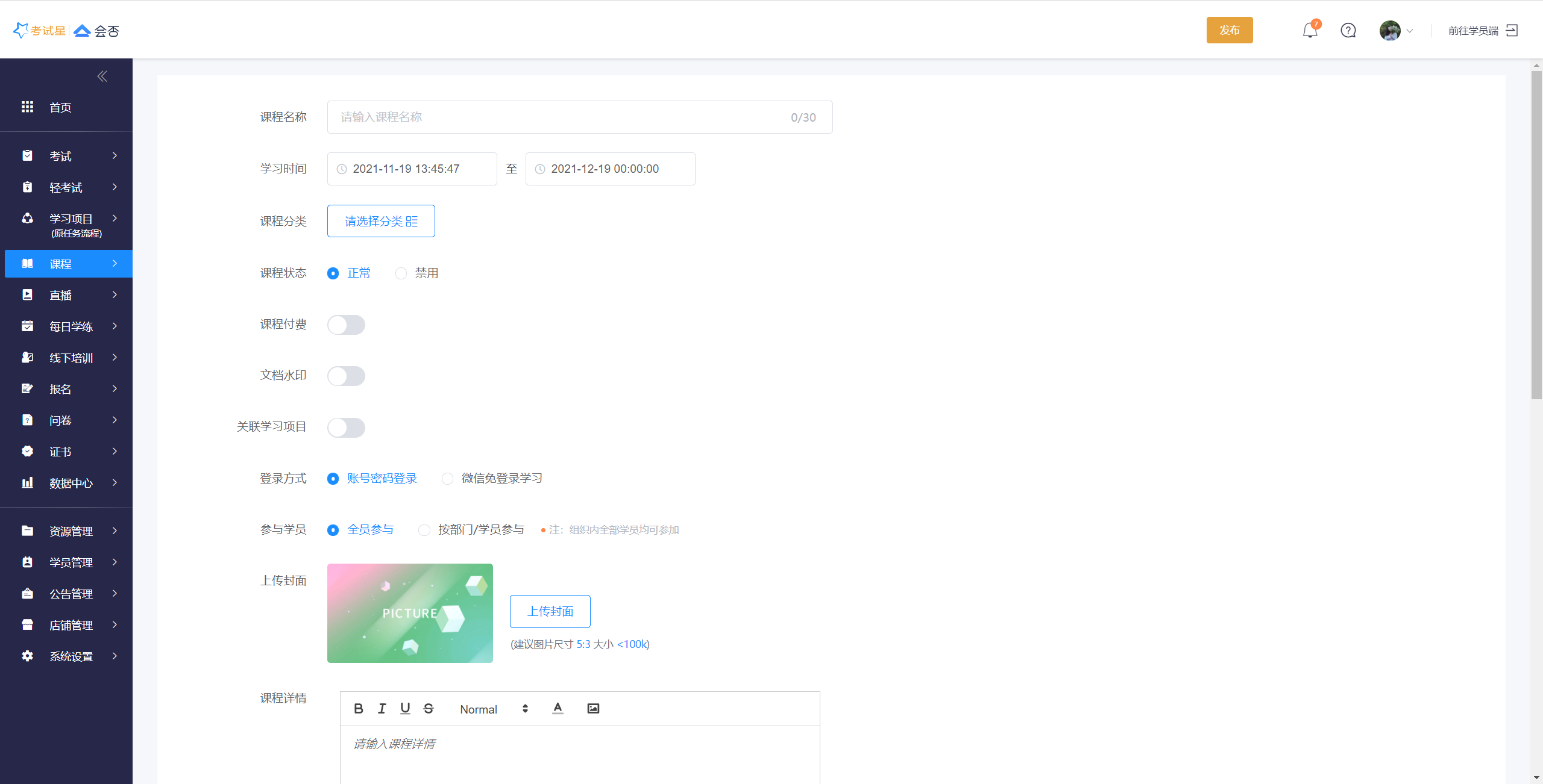 点击管理端左侧菜单中的“创建课程“按钮,进入创建课程流程。