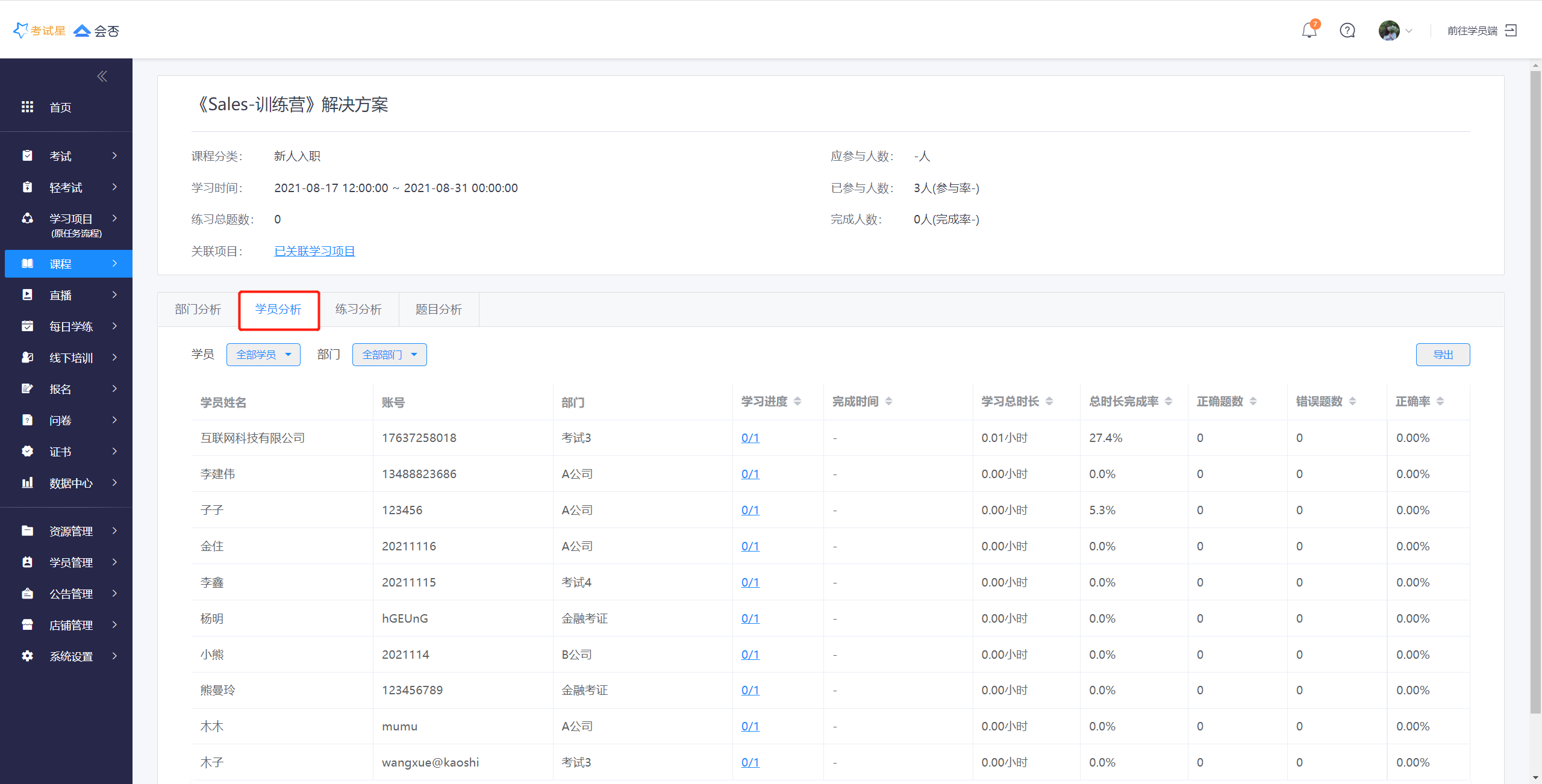 在【课程管理 - 分析课程 - 学员分析】,可以查看到每个学员在课程中学习到哪个课件,以及每个某个课件学习的百分比;如果课程中用到了练习,还可以查看每个学员的练习对错情况,了解学员对于知识点的掌握情况,以及是否认真学习