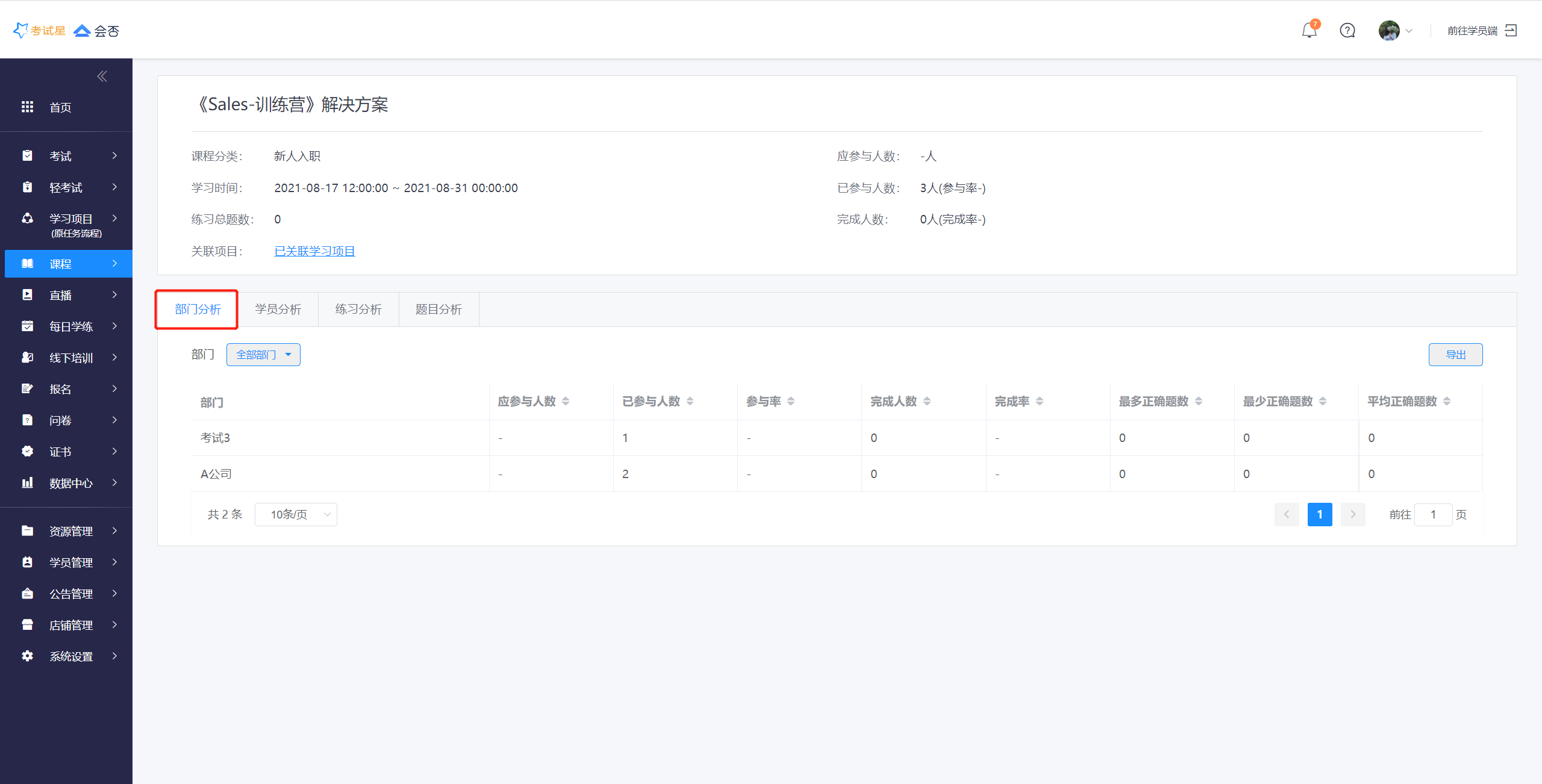 在【课程管理 - 分析课程 - 部门分析】,可以查看到每个参与部门的应参已参情况、完成情况、课程练习中的正确题数情况。(常用于部门间学习情况对比)