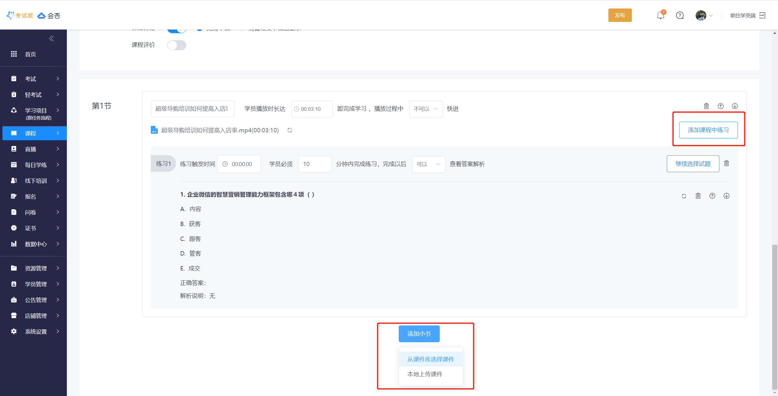 * 视频练习:视频课件可以选择时间点插入练习,每个课件最多添加10个练习,建议合理安排练习数量,避免学员产生抵制情绪