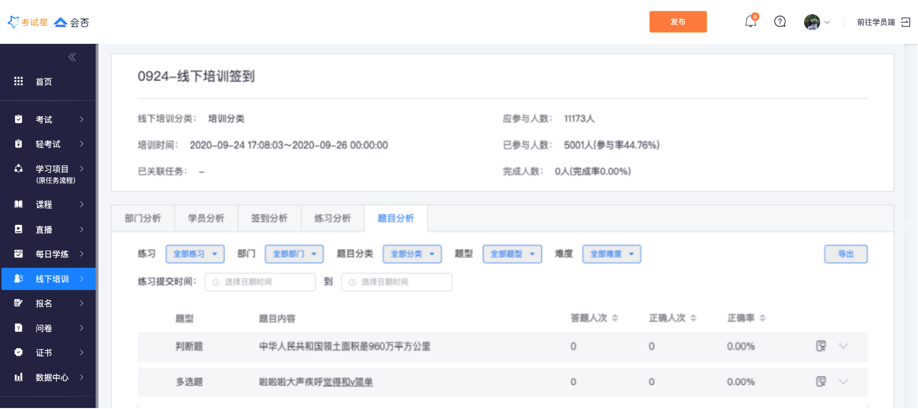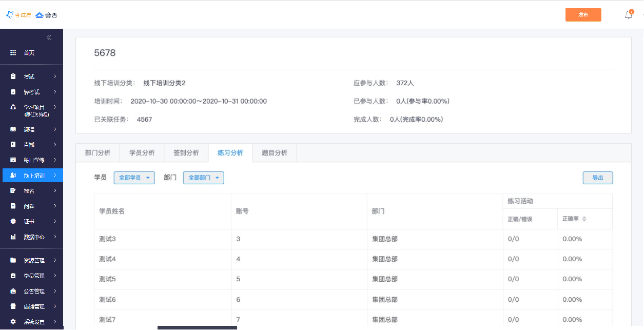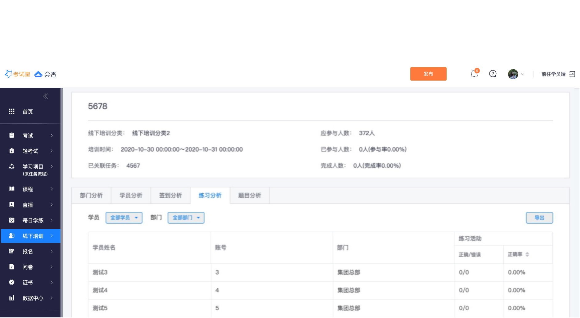 ### 7.3.2 **查看学员是否参加了培训,以及在培训期间签到率和练习正确率**