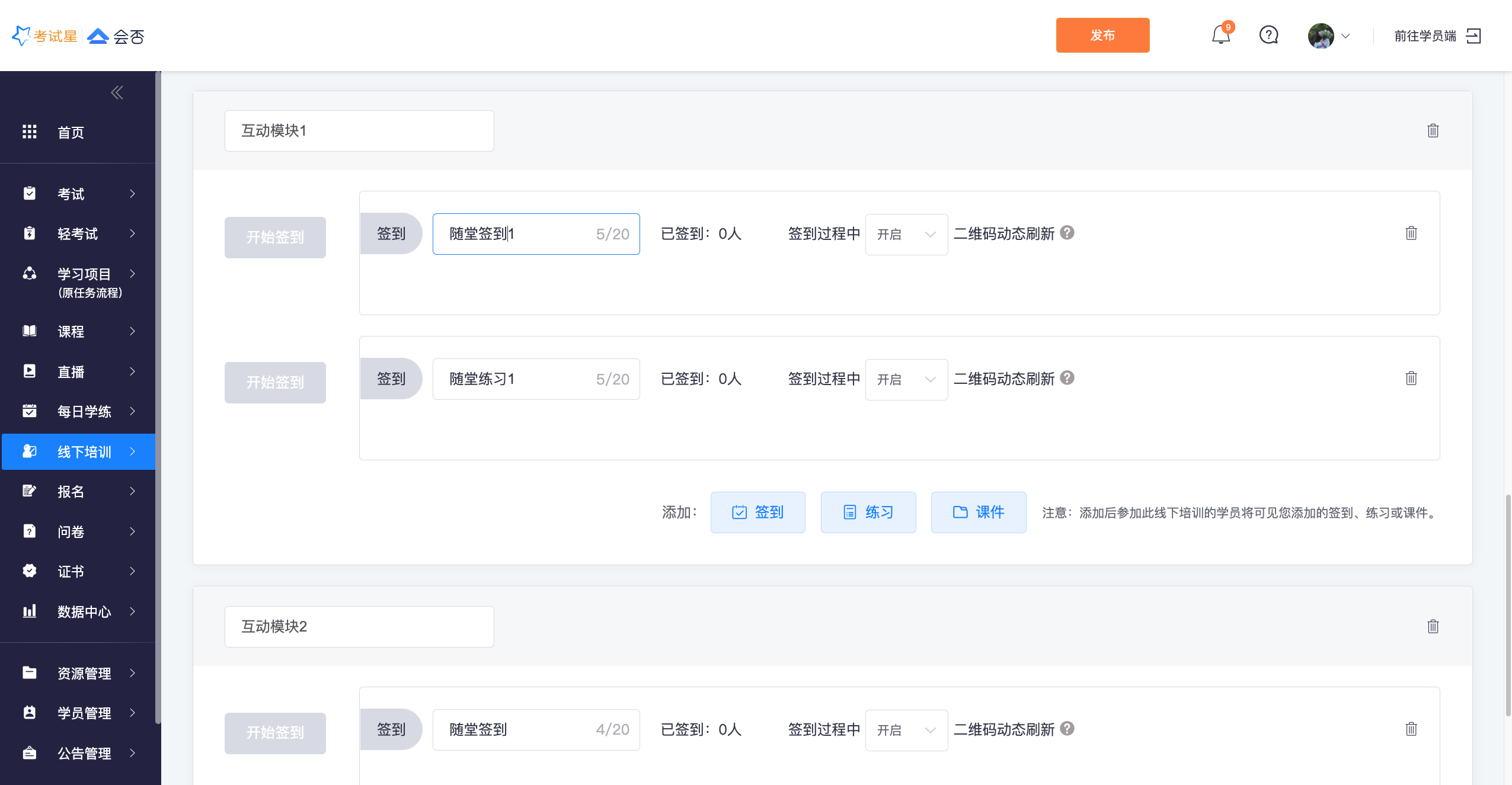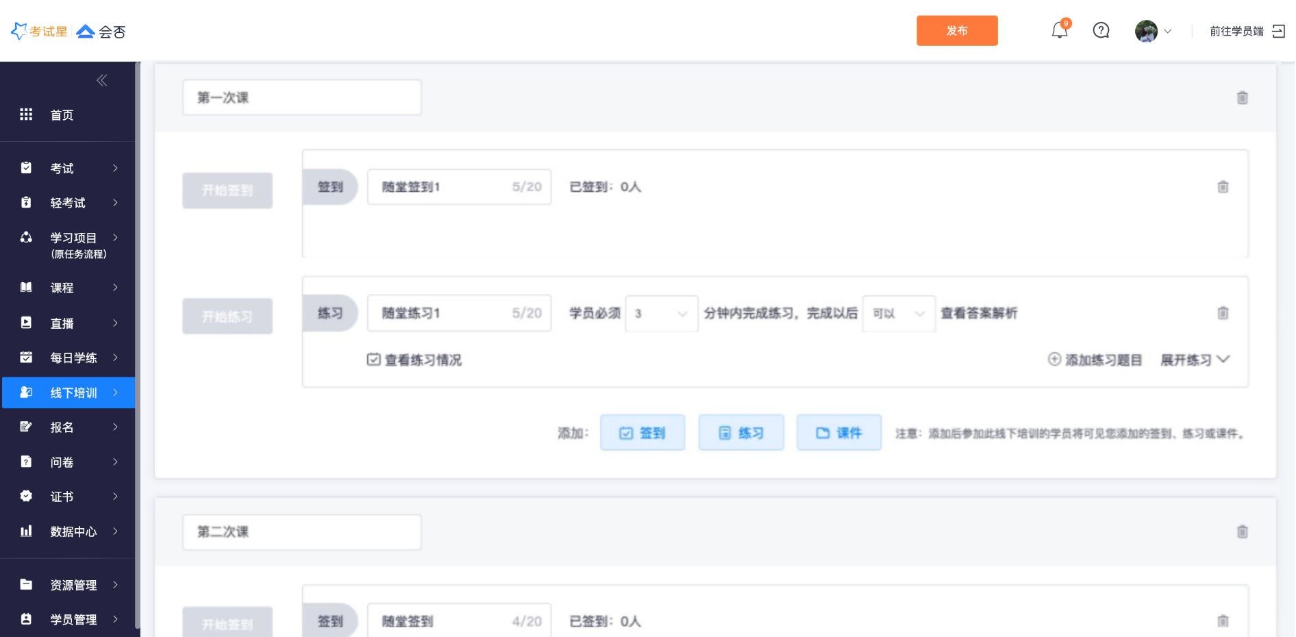* 练习:可提前准备好签到,或现场临时添加练习,学员练习时管理端可实时查看练习数据