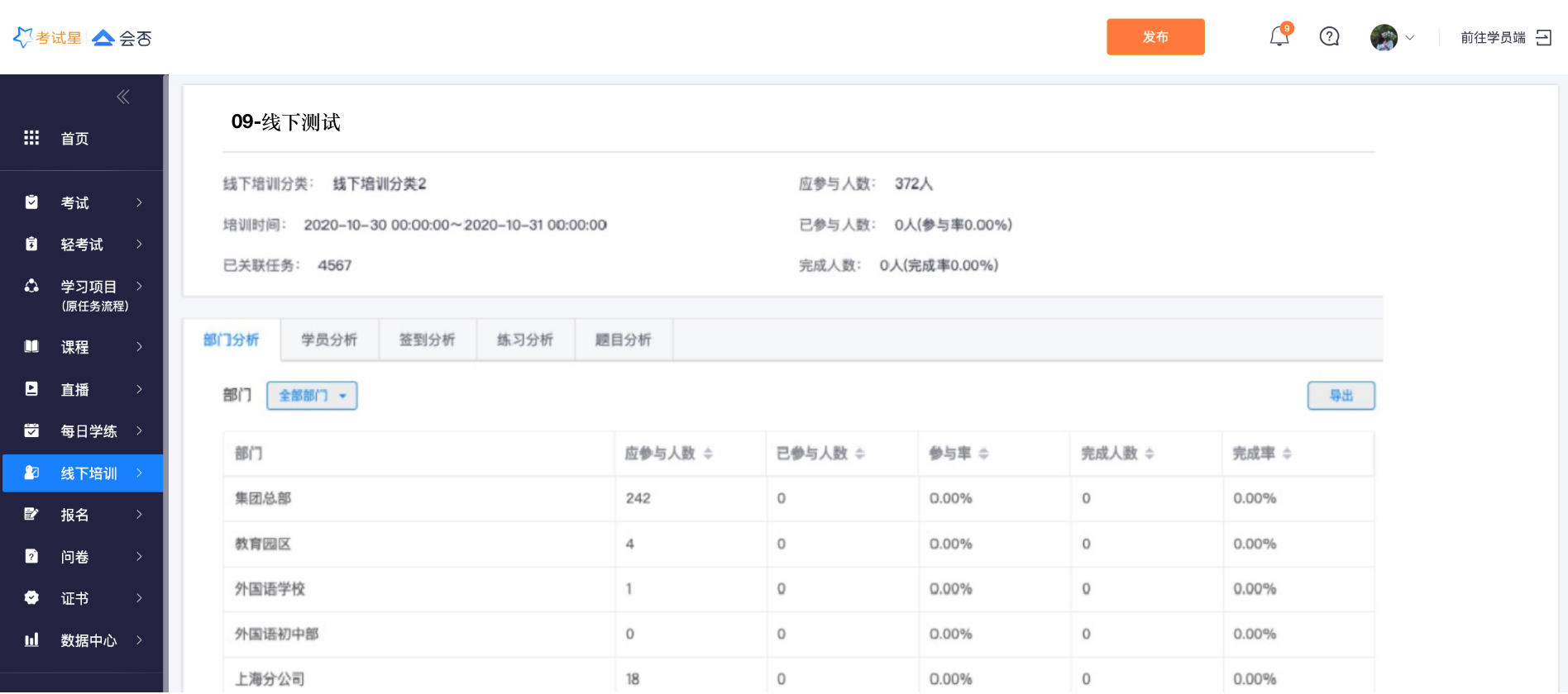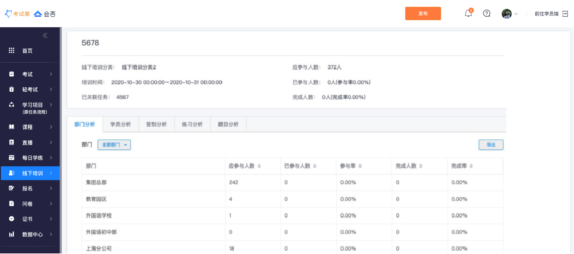 (注意:查看学员完成情况之前,请在线下培训的编辑页中,点击“立即结算完成情况“,然后再去查看统计数据)