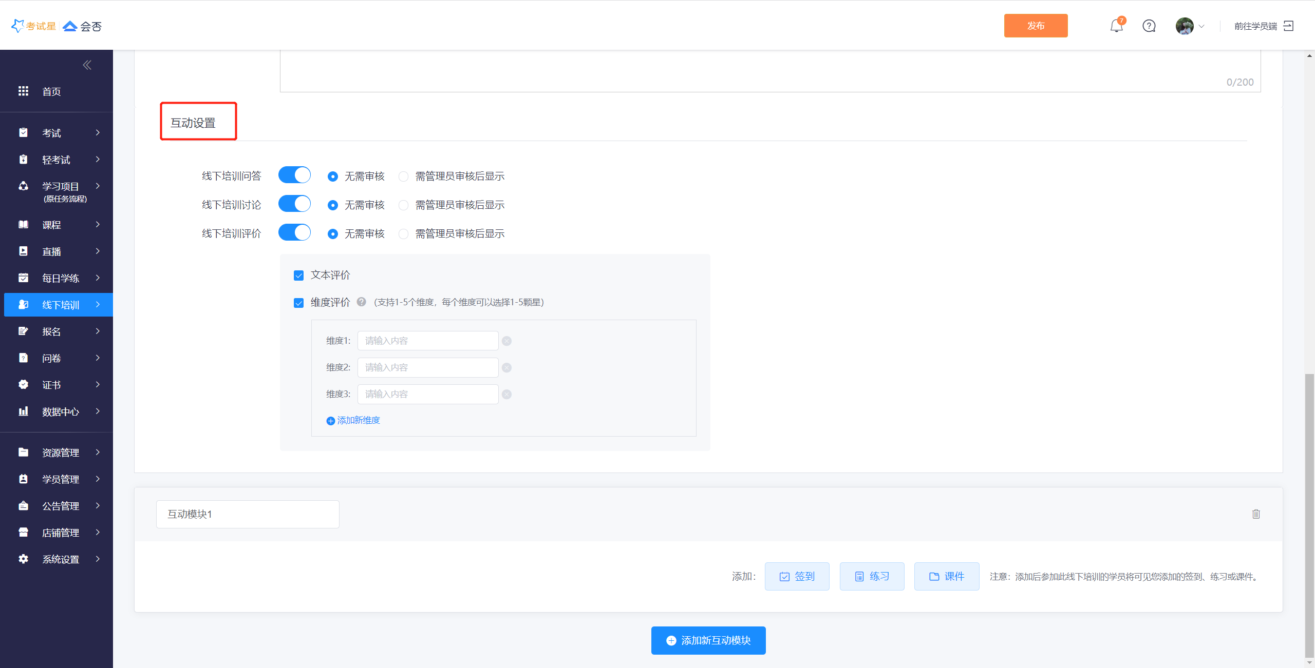 * 线下培训评价:学员给培训进行评价,可设置评价维度