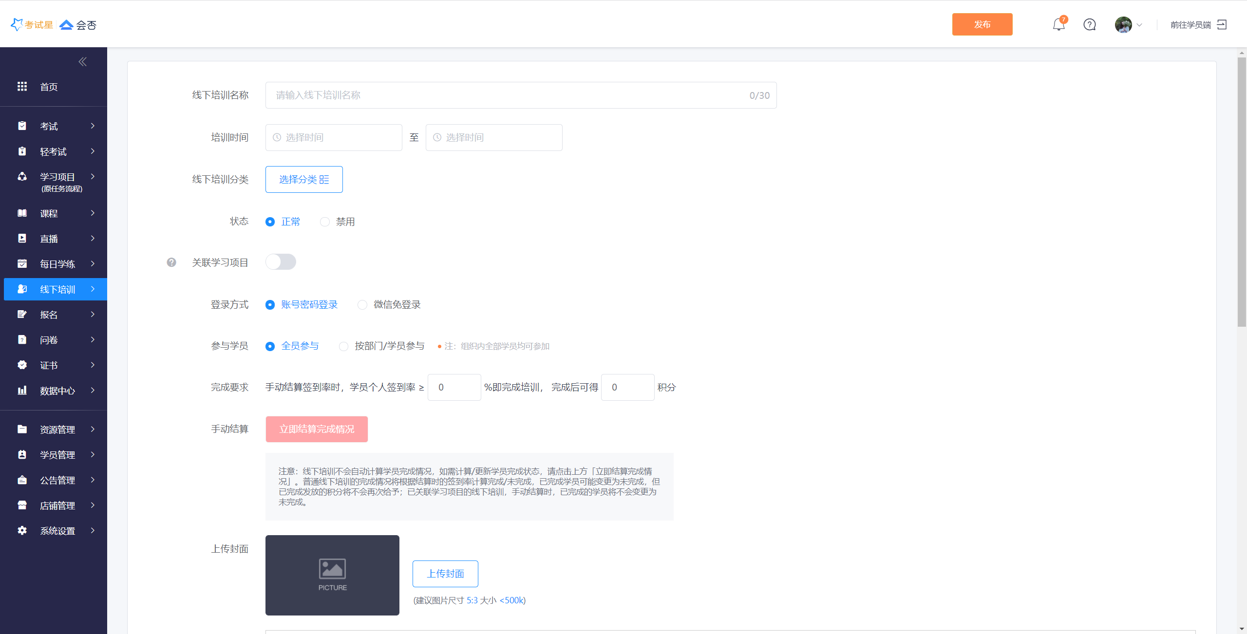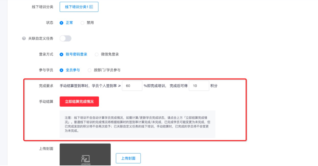 * 设置完成要求:线下培训的核心要起即为到场,故完成要求设定根据签到率进行判定,学员在线下培训中,签到率大于等于设定值后即可判定完成,并且给予积分。