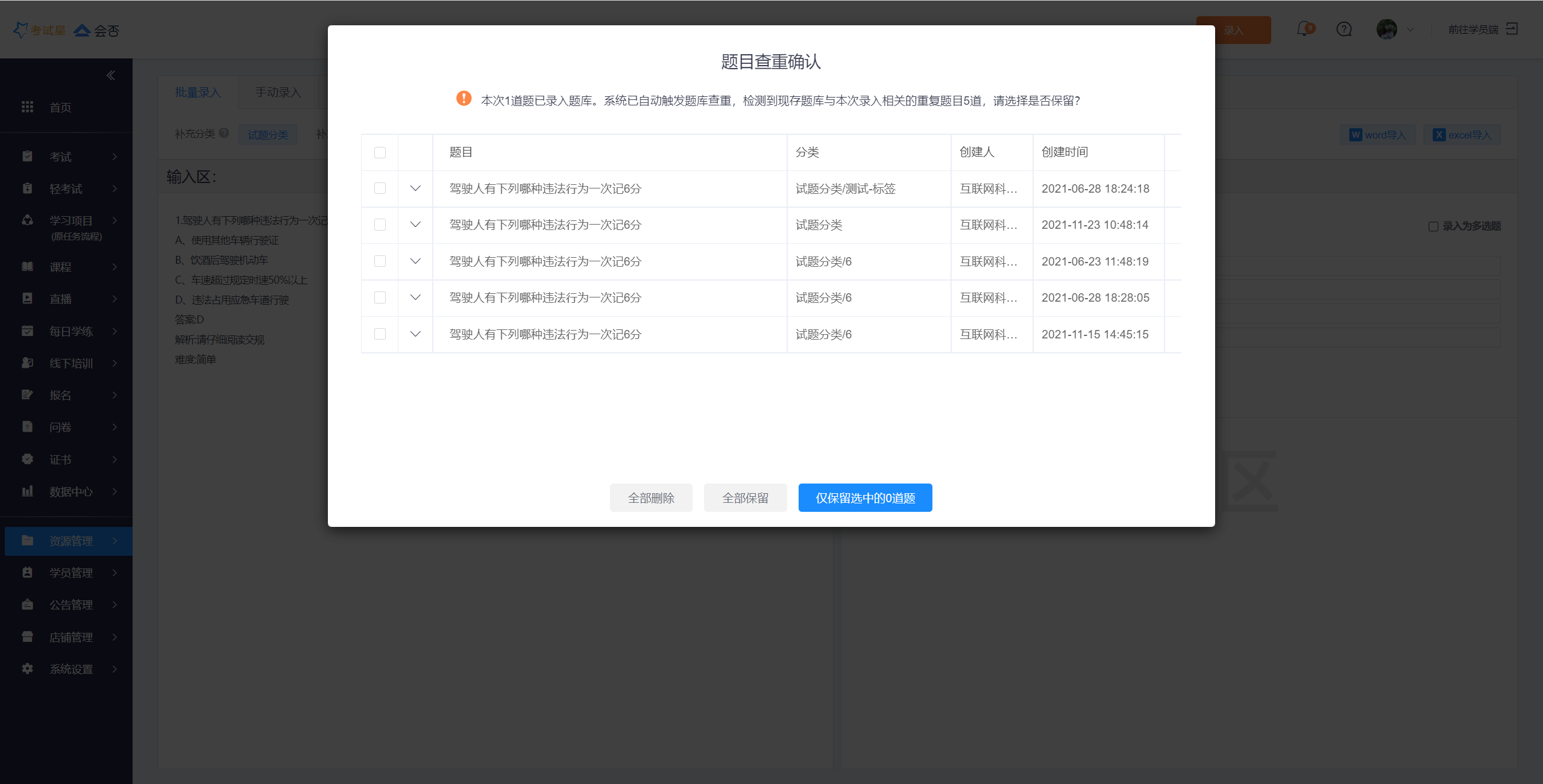 **Step2**:若本次录入的题目与题库中题目存在重复,则会触发查重,针对重复题目可选择删除或保留