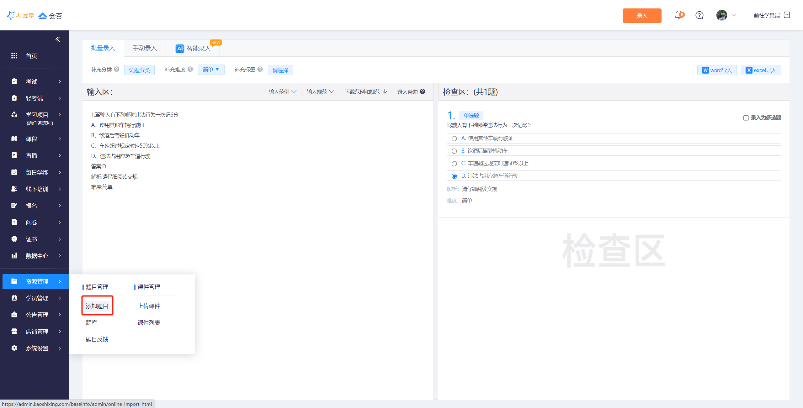 若您第一次组织培训考试,没有题库积累,推荐您学习并使用批量录入功能!