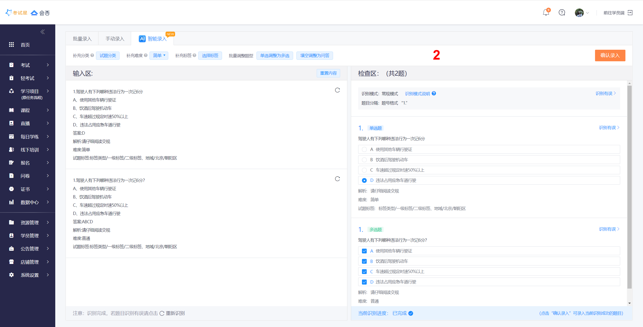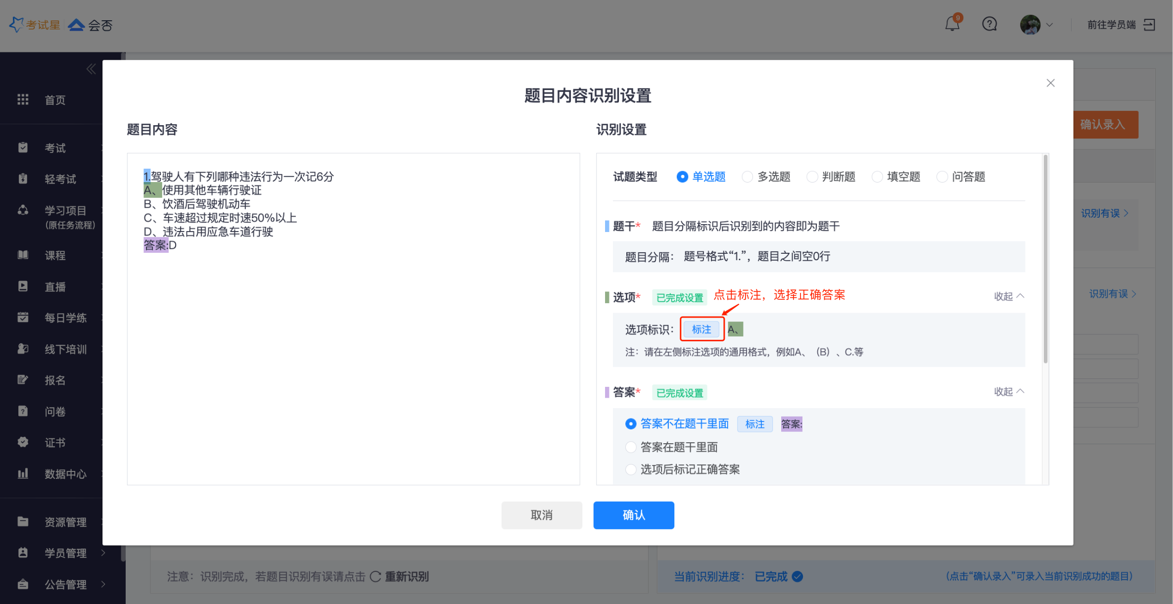 **Step2**:题目内容标注弹框,确认Ai识别题目内容是否正确,若与题目实际格式差别较大,可手动调整标注内容;若没有问题就可以开始录题