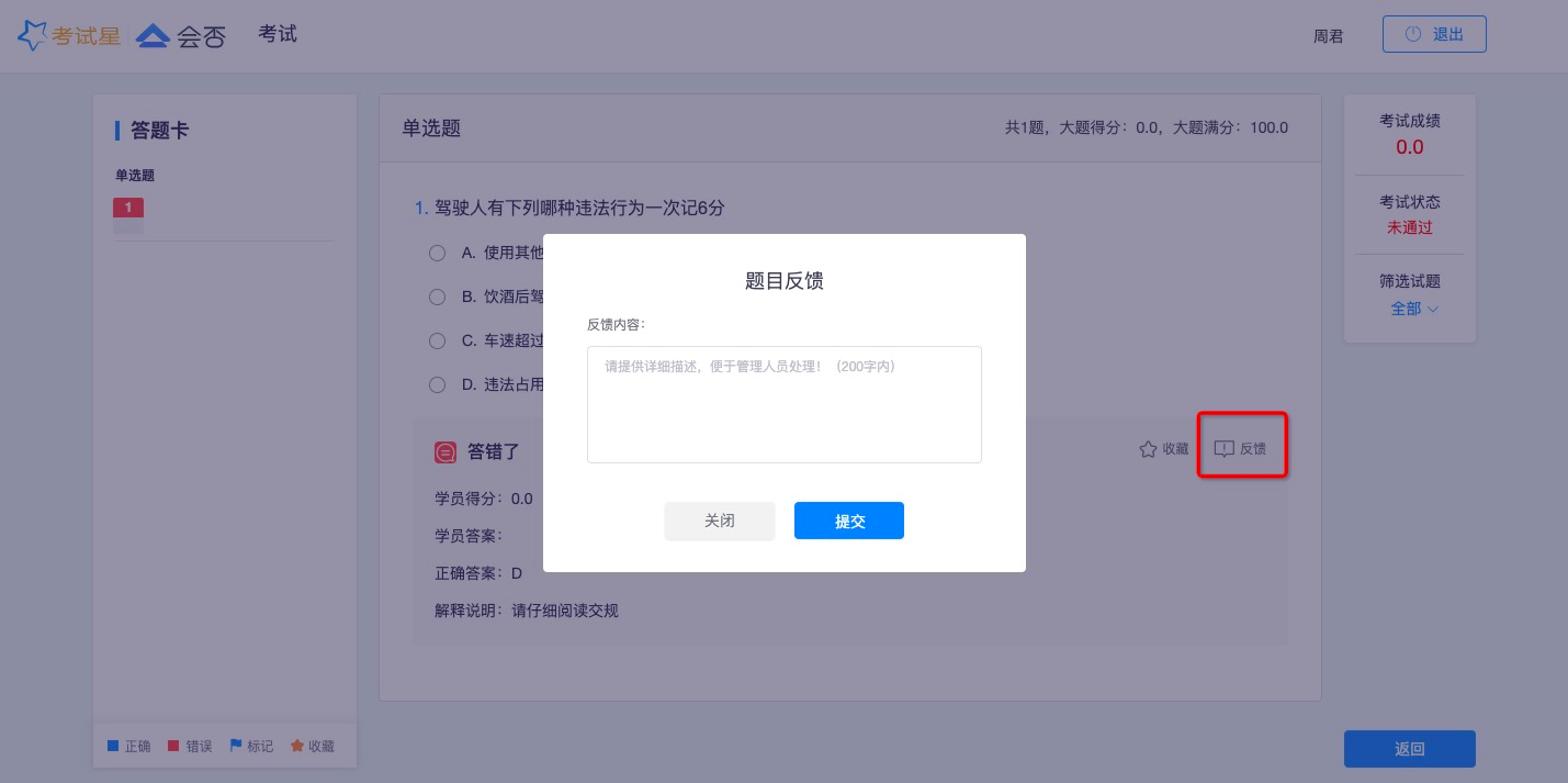 * 学员在查看历史考试时,查看答卷中可以针对题目反馈