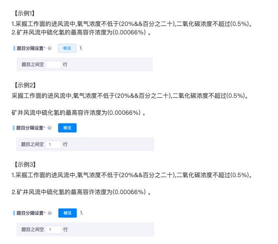 * **题目分隔设置**:如果一次要录入很多道题,那么题目和题目之间肯定有某种分隔的方式,列举三种常见示例:(题号、空行,两者至少需设置一项)