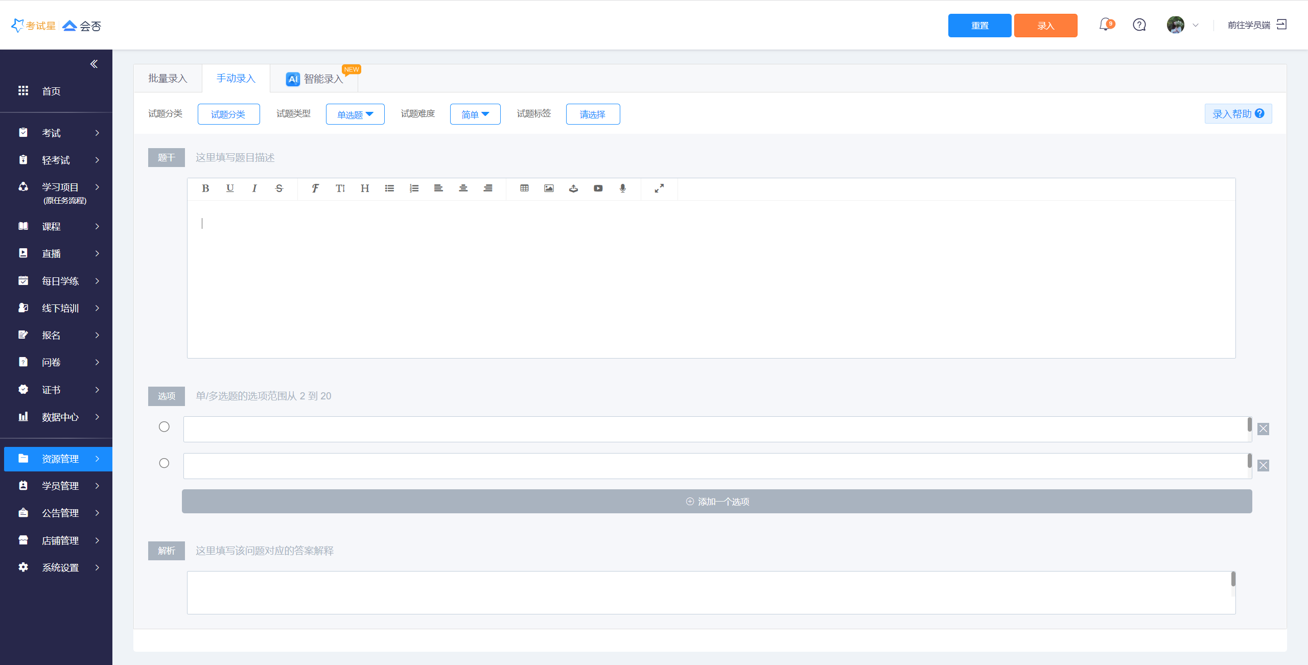 如果题目中需要用到各种多媒体文件,则推荐使用手动录入,批量录入支持在题目中插入音视频、图片、附件;并且手动录入还可以增加单选、多选、填空题的选项个数/填空数至20个。