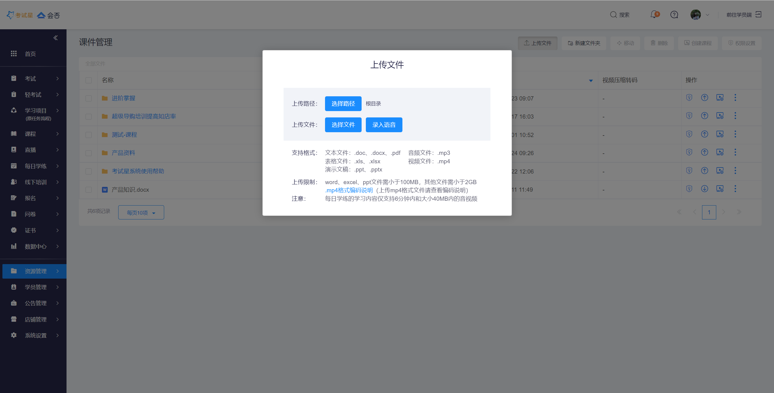 课件是会否培训平台的基础数据之一,可用于课程、线下培训、每日学练。