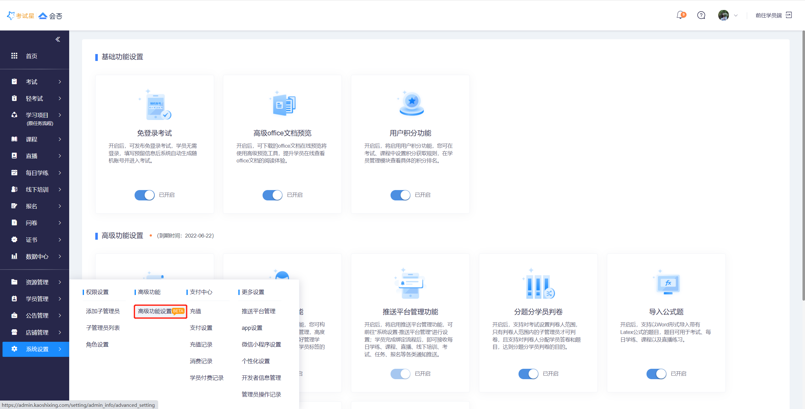 高级功能设置仅主管理员可以设置,可启用/关闭部分高级功能,请根据实际业务场景选择使用!
