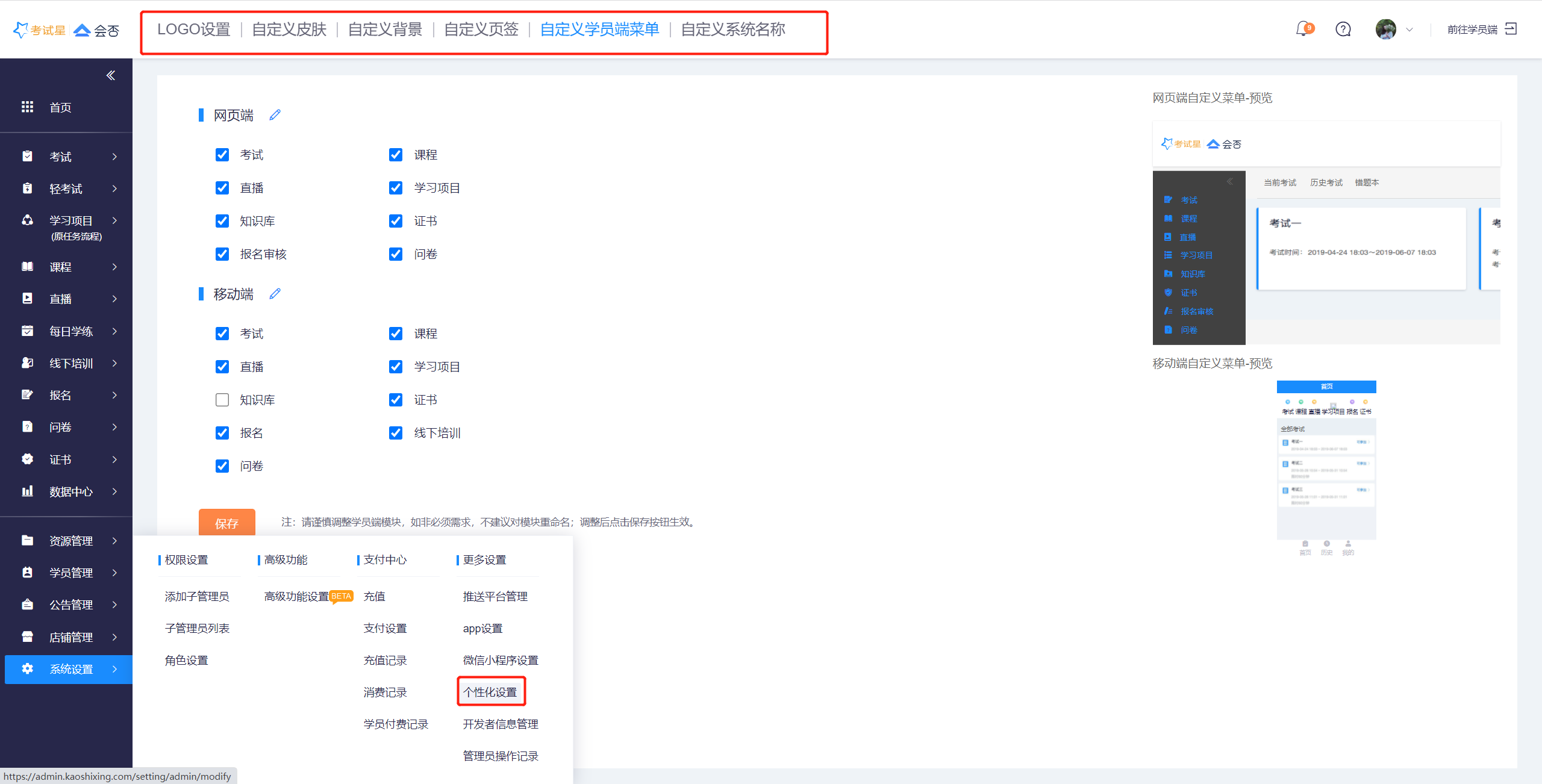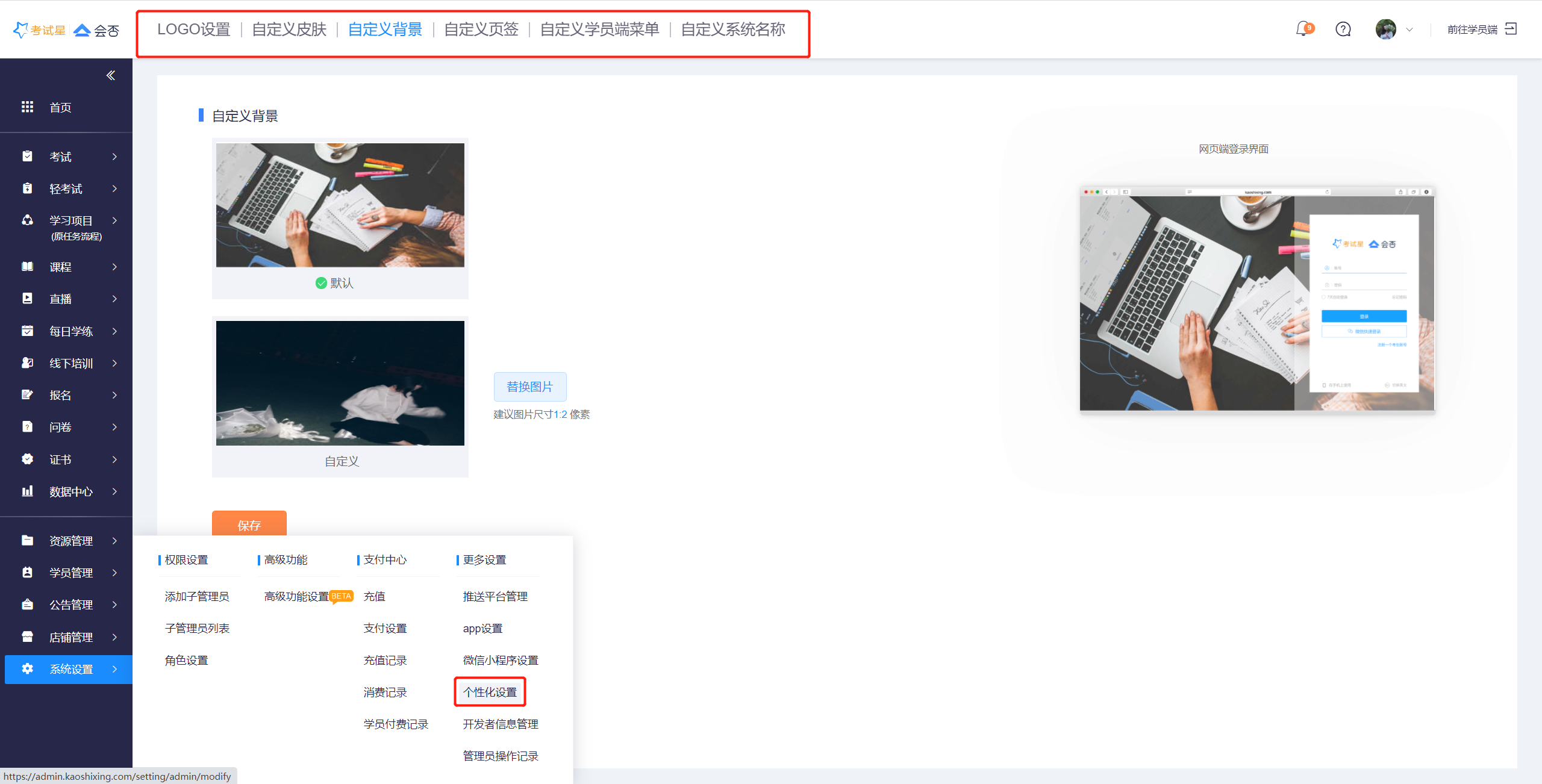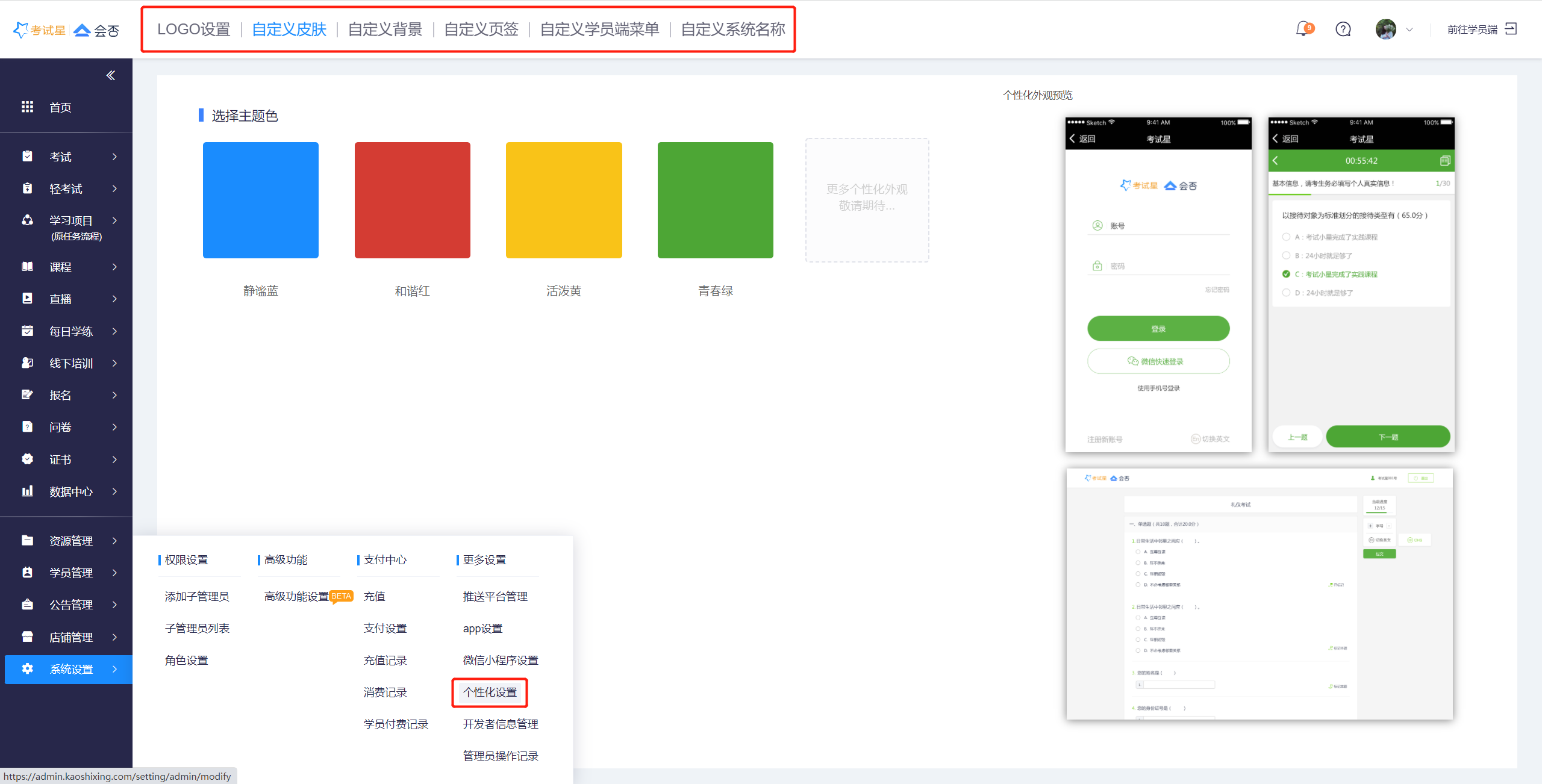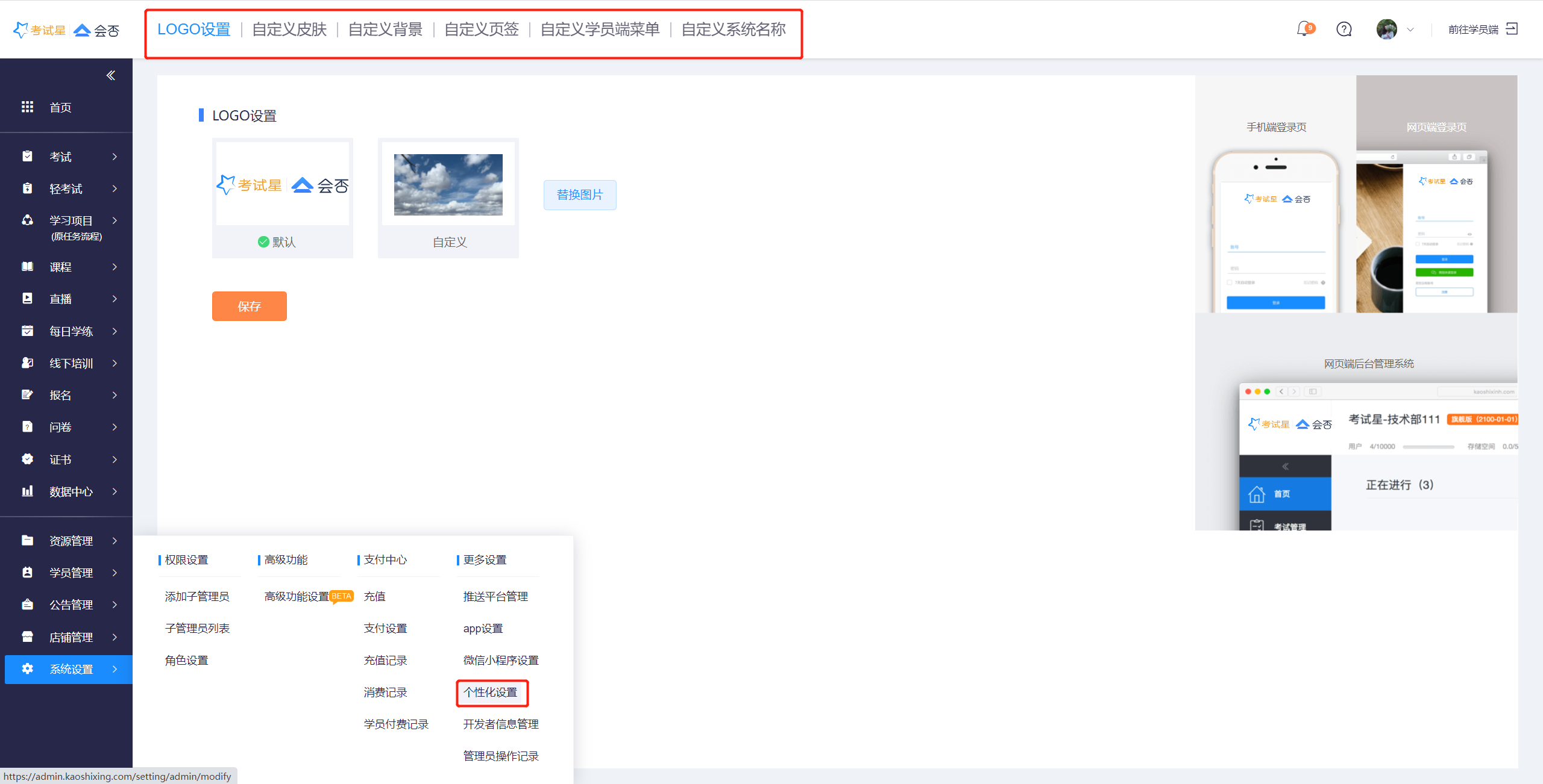 在此可以对系统进行个性化设置,支持logo设置、自定义皮肤、自定义背景、自定义页签、自定义考试页、自定义学员菜单、自定义系统名称;