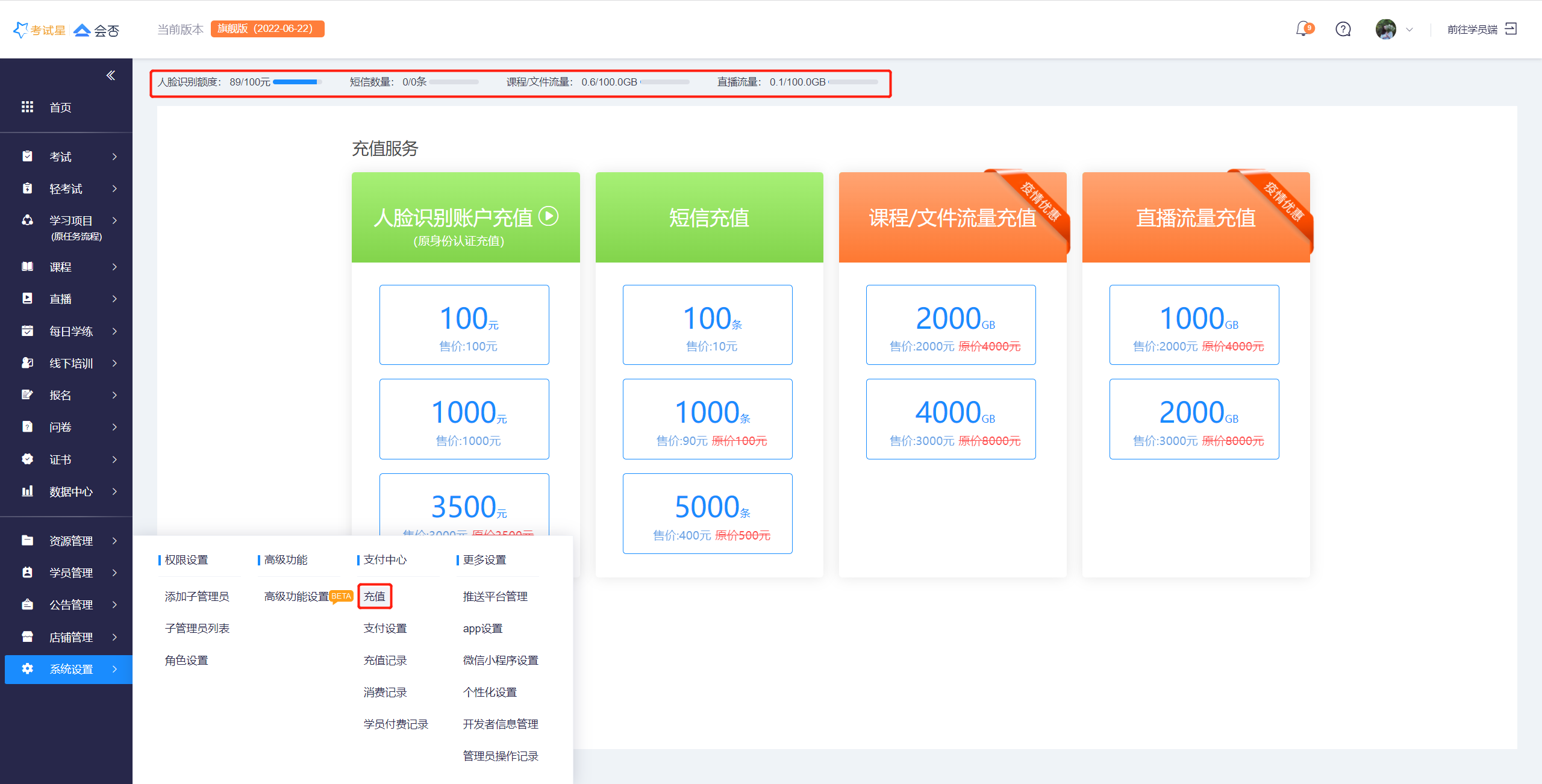 当前系统版本信息、到期时间,人脸识别账户余额、剩余短信条数、剩余课程/文件流量、直播流量;