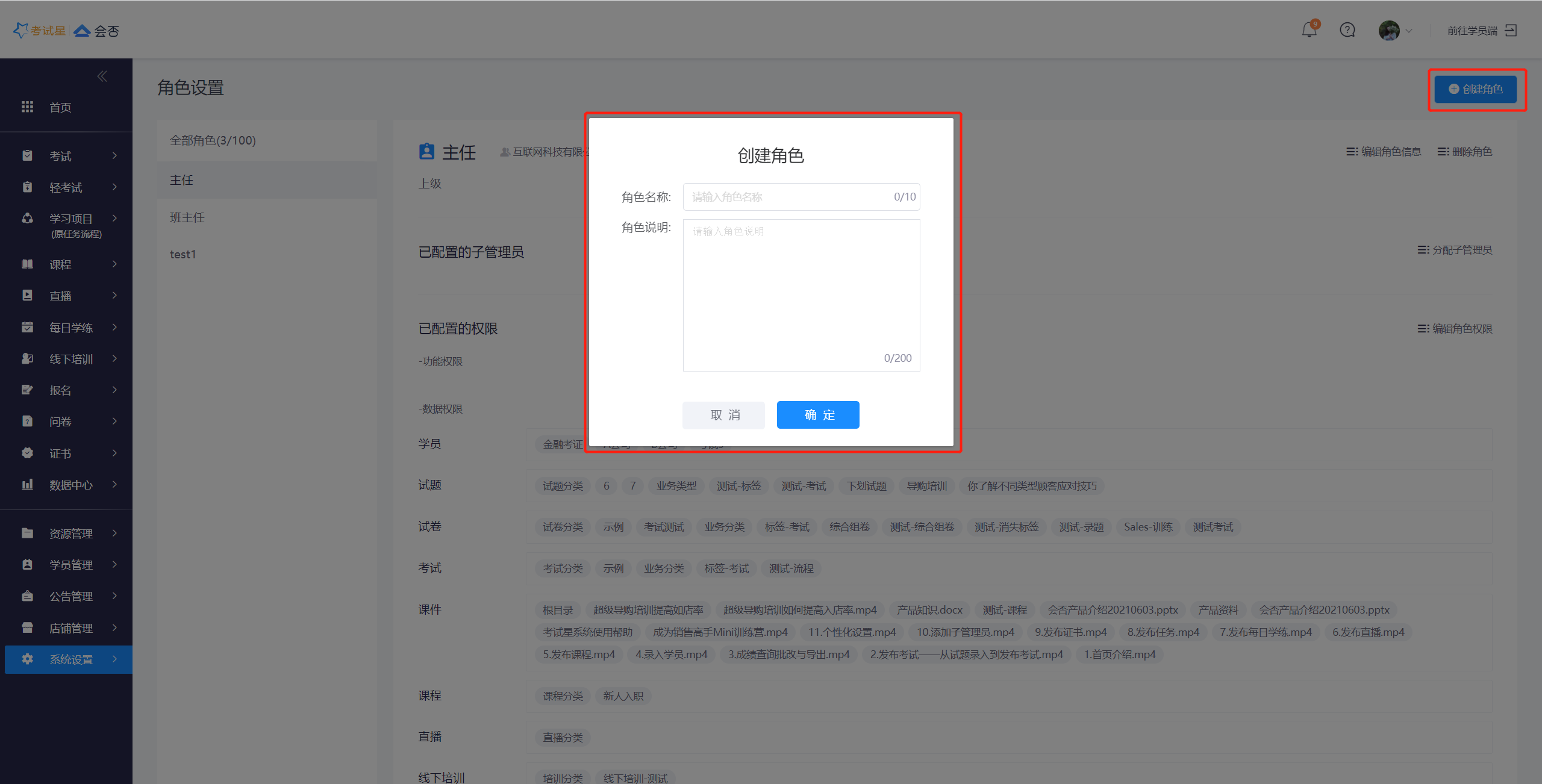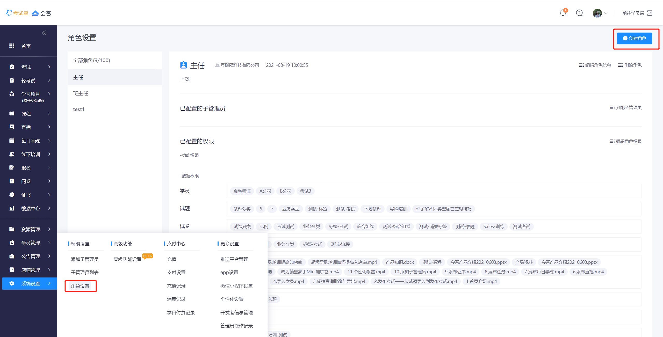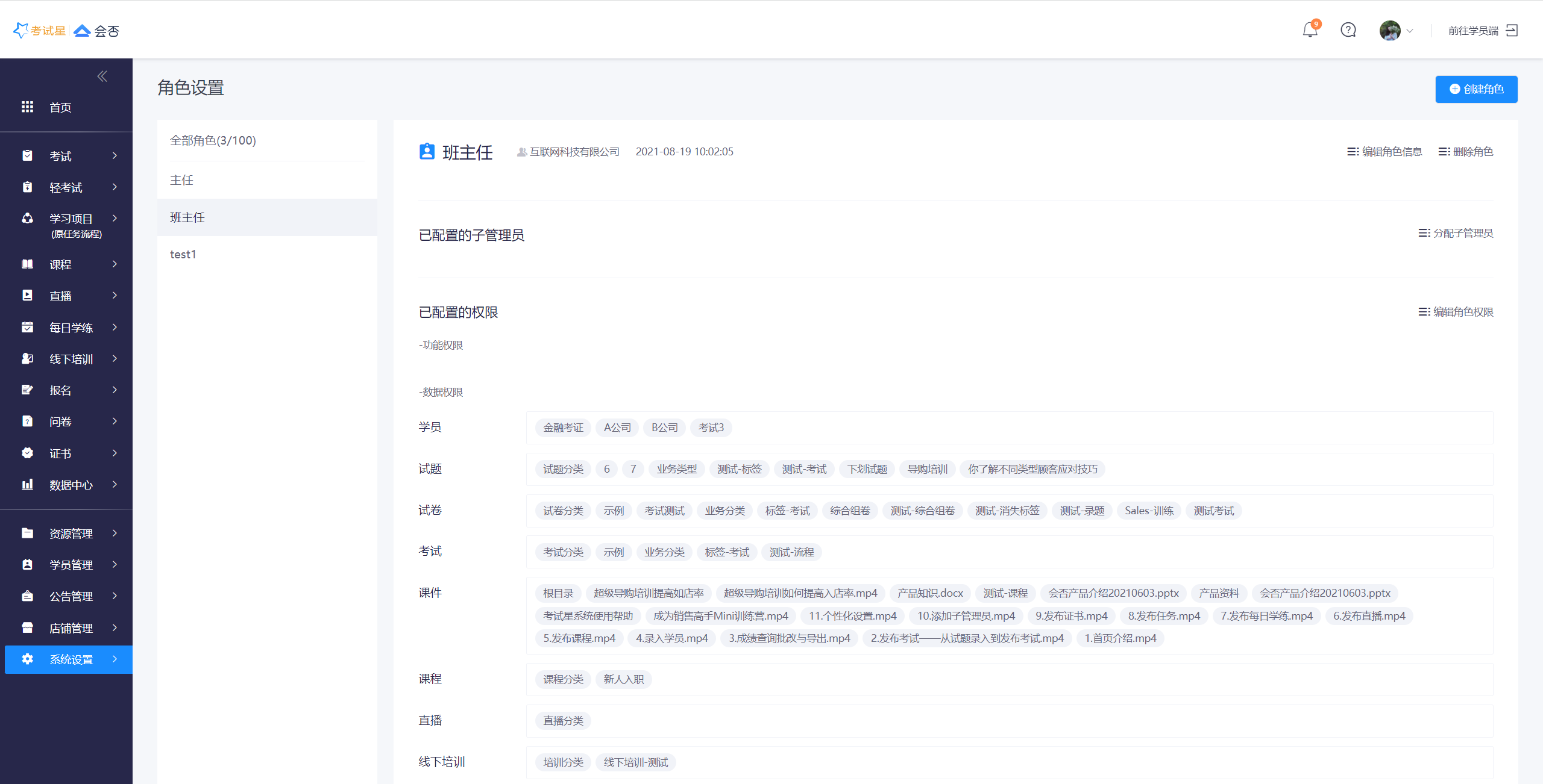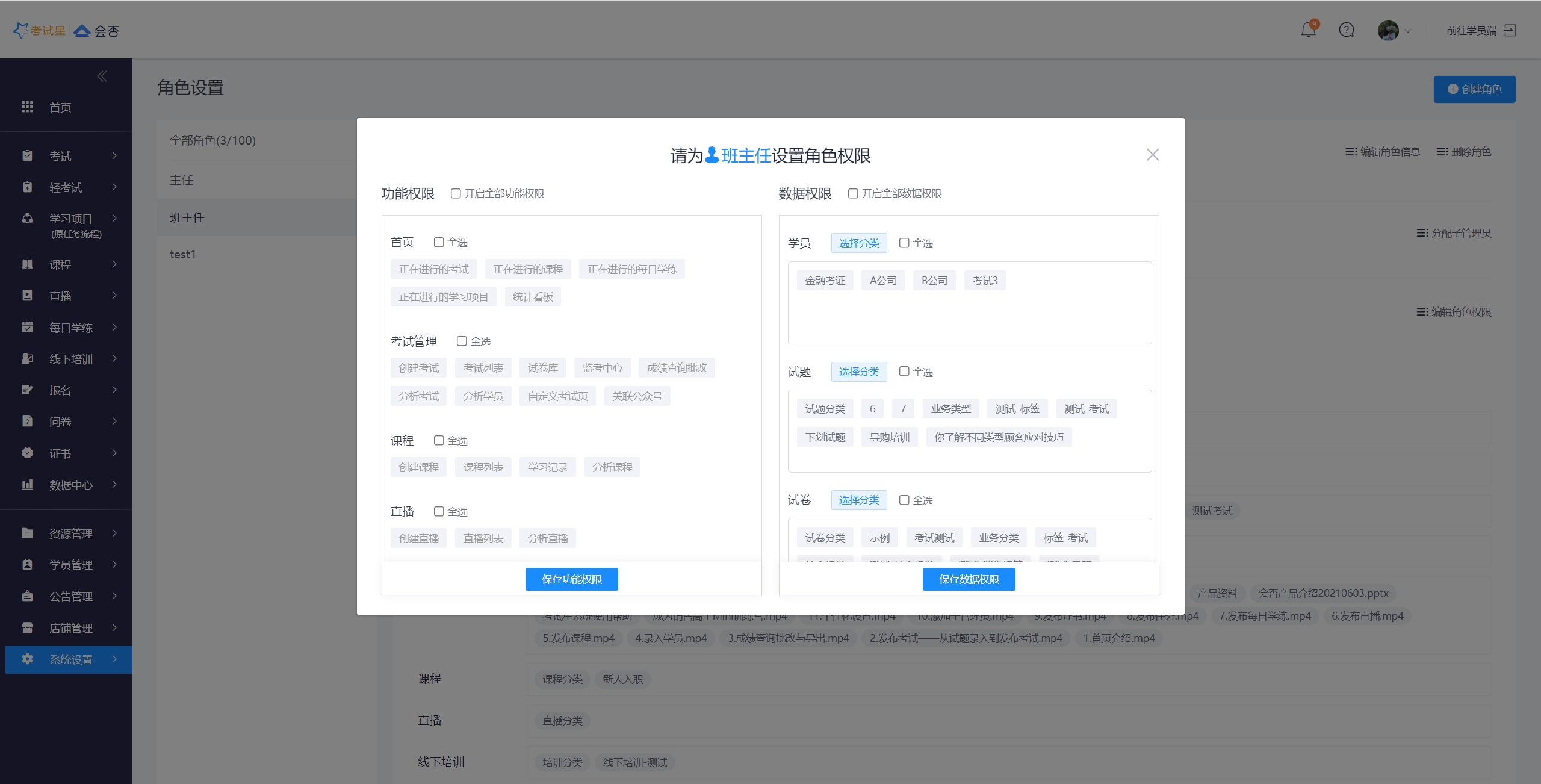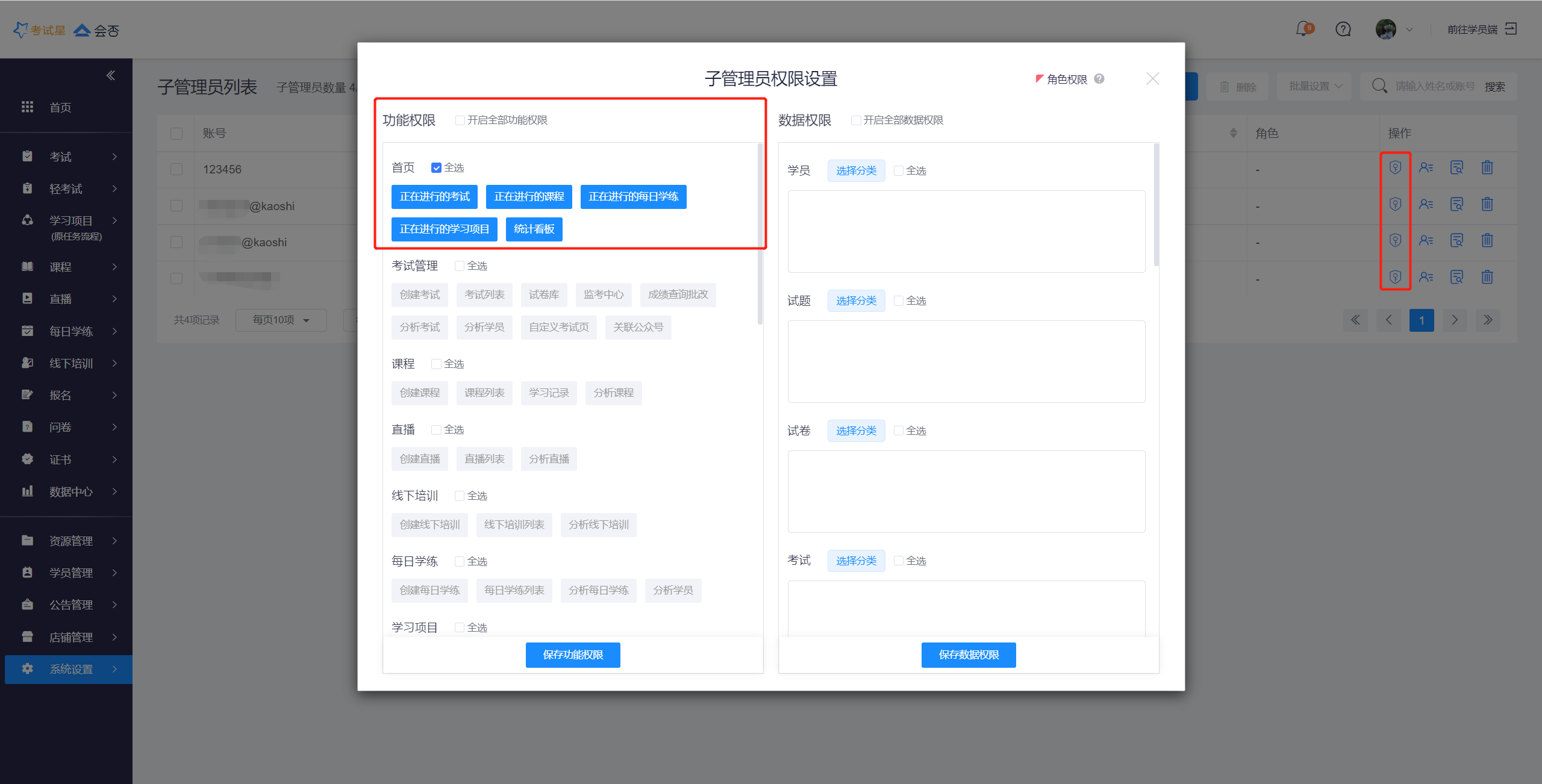 - 数据权限:控制子管理员可见的数据范围,例如:一年级的老师只可以看到一年级的考试和课程等内容,数学老师只可以看到数学题目等。