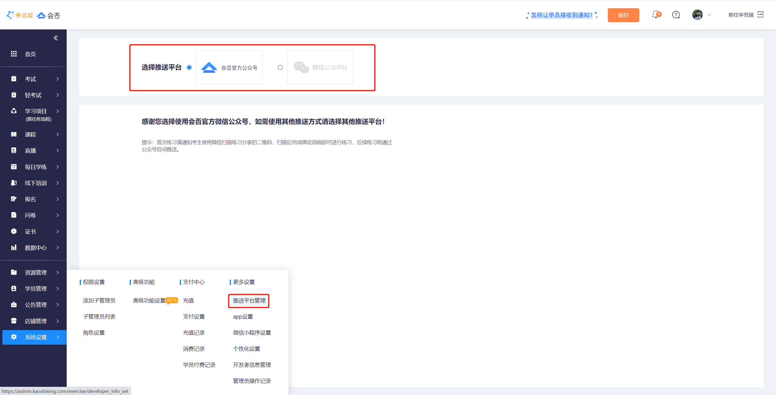 **推送平台管理功能**:开启后,将启用推送平台功能,管理者可通过推送平台给学员推送课程、考试、每日学练等通知;若开通了每日学练,则推送平台功能将默认开启且不可关闭;