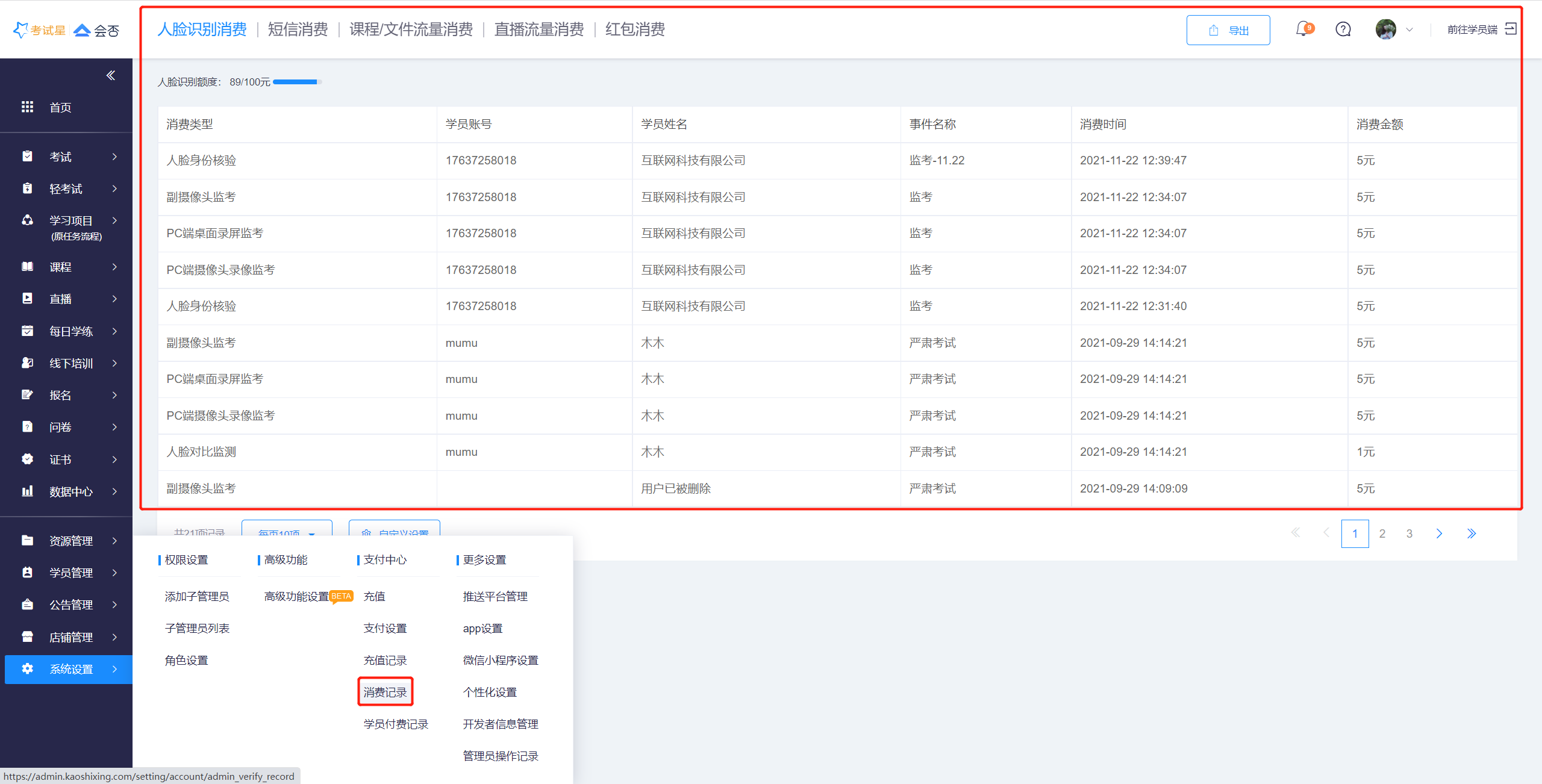 在此可以查看人脸识别消费、短信、课程/文件流量、直播流量、红包的消费记录;