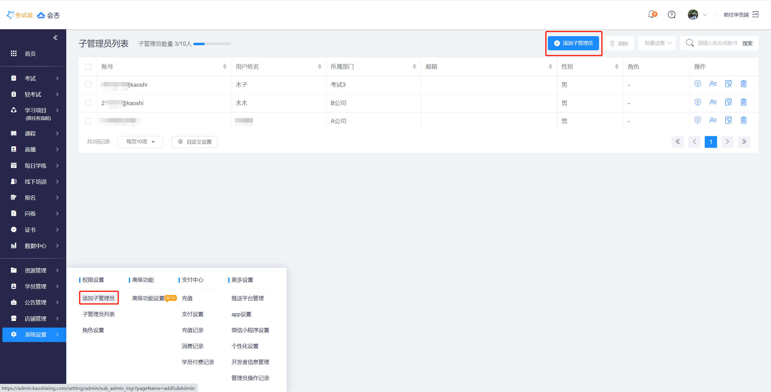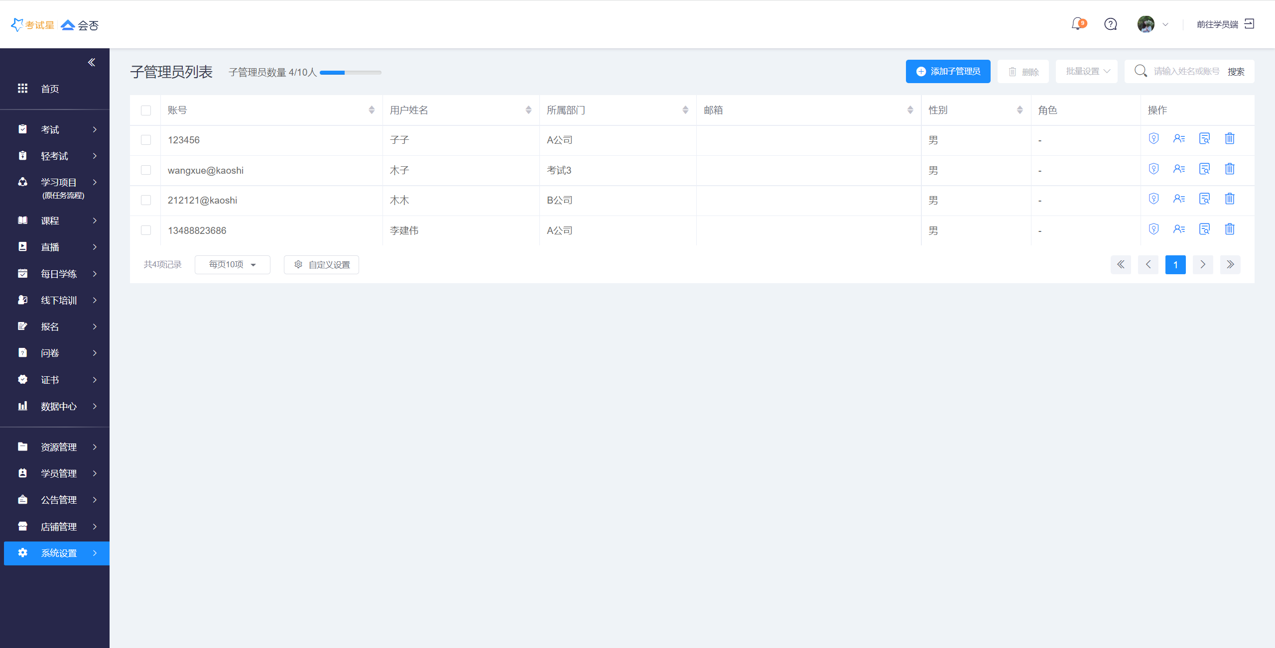 系统中所有子管理员均可在子管理员列表中管理,例如:增删改子管理员、更改子管理员角色权限等