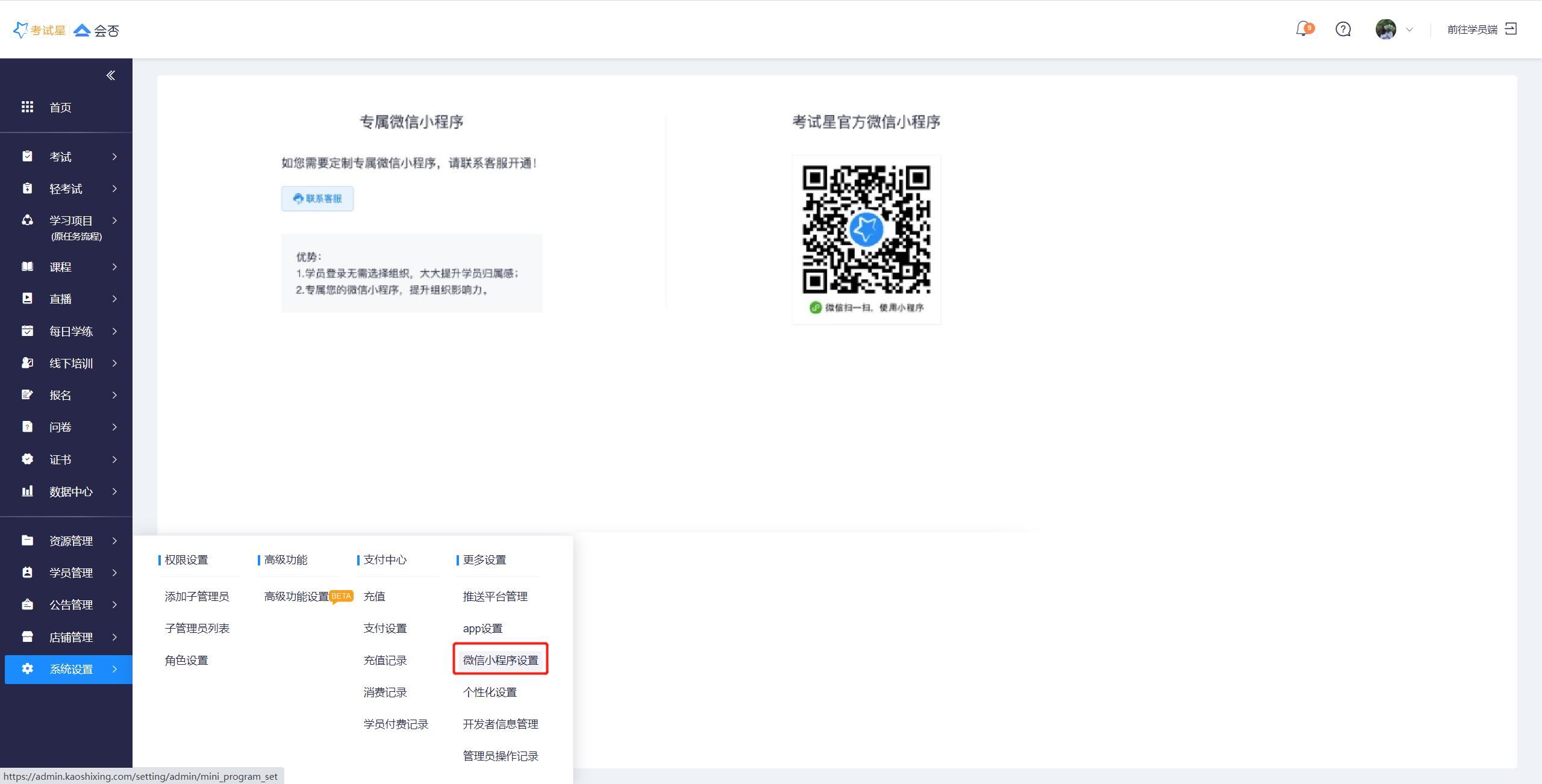 可使用考试星&会否官方微信小程序,学员在微信小程序可直接搜索“考试星”免费使用微信小程序;**可付费开通专属小程序,专属小程序的图标名称均支持客户定义**;