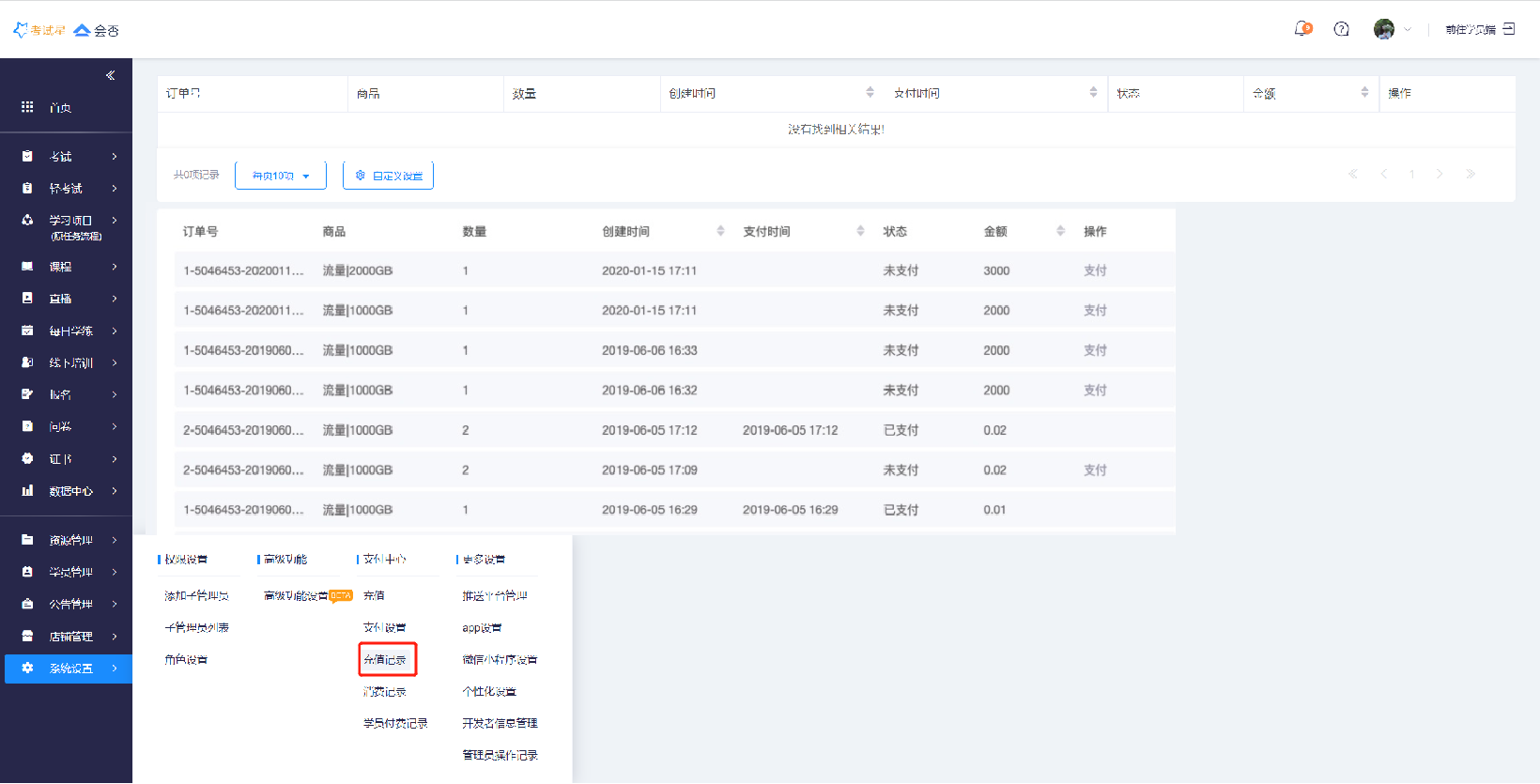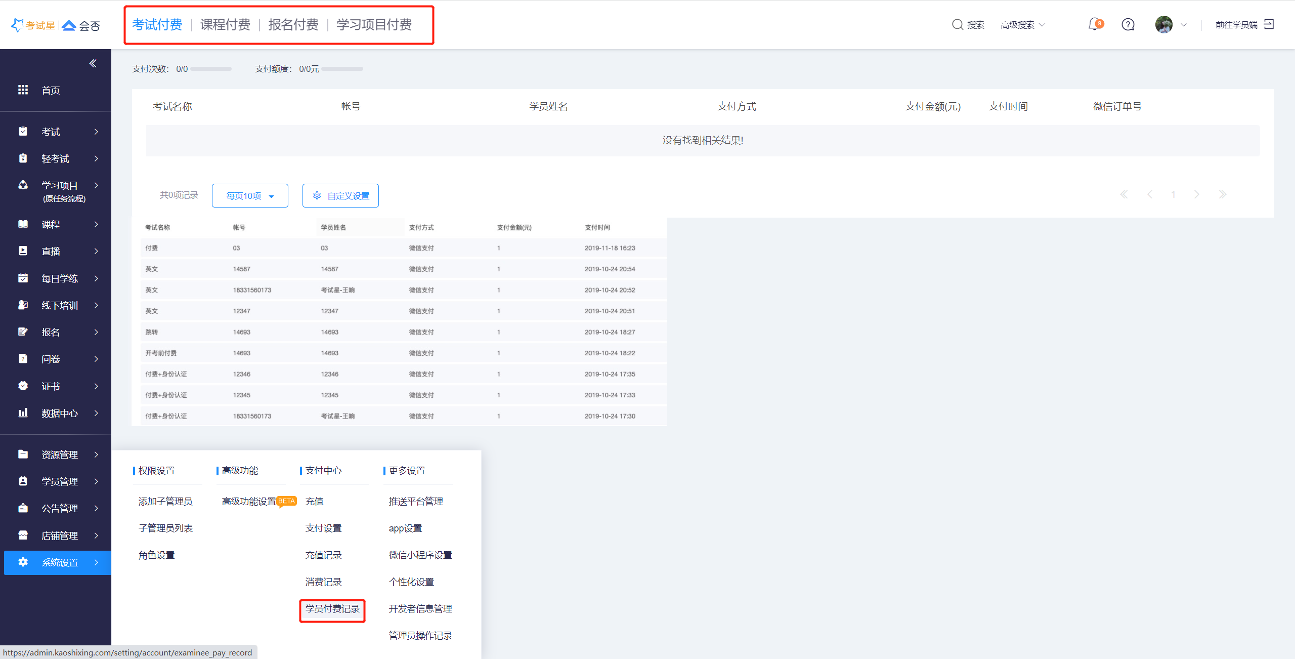在此可以查看考试、课程、报名、自定义任务的学员付费记录;