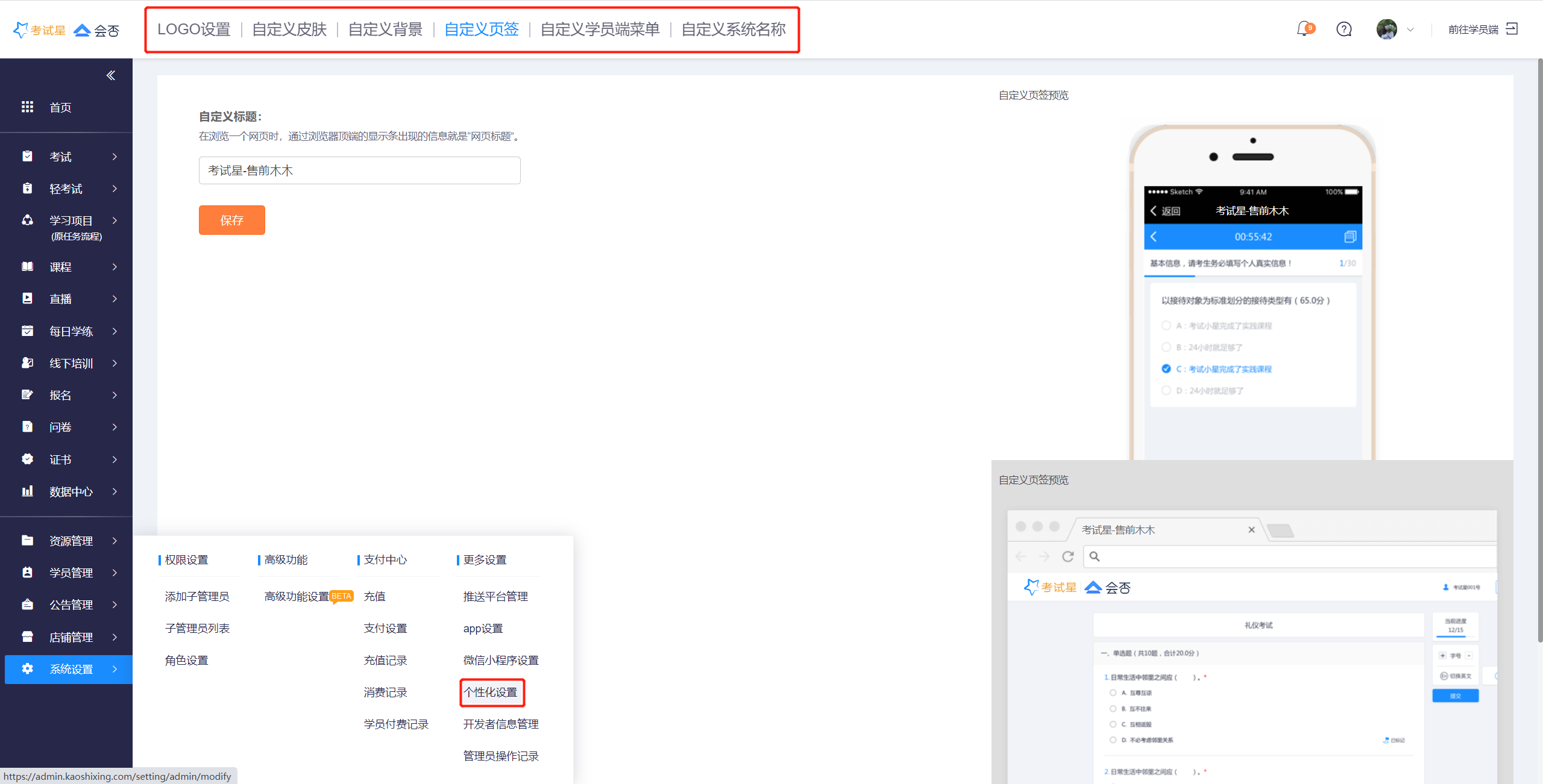 **自定义页签**:可以编辑自定义文字进行更改,最多不可超过10个字,自定义页签将会在学员登录系统的学员端时浏览器顶端显示条出现,如不设置将默认显示为“考试云平台”,右侧可以进行样式预览;