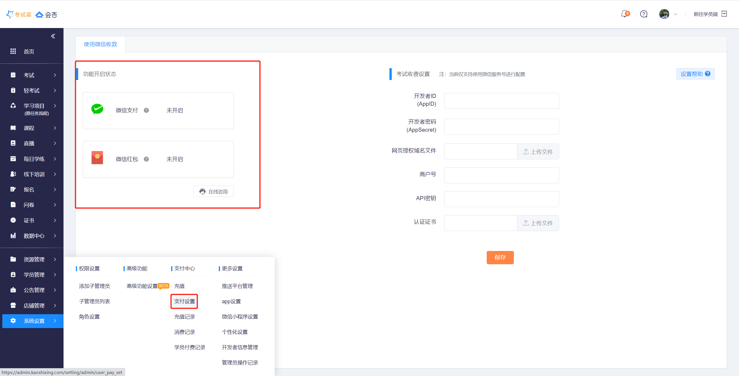 **微信支付**:开启微信支付功能,学员可通过微信支付考试费用,费用将自动转至企业的微信收款账户中;