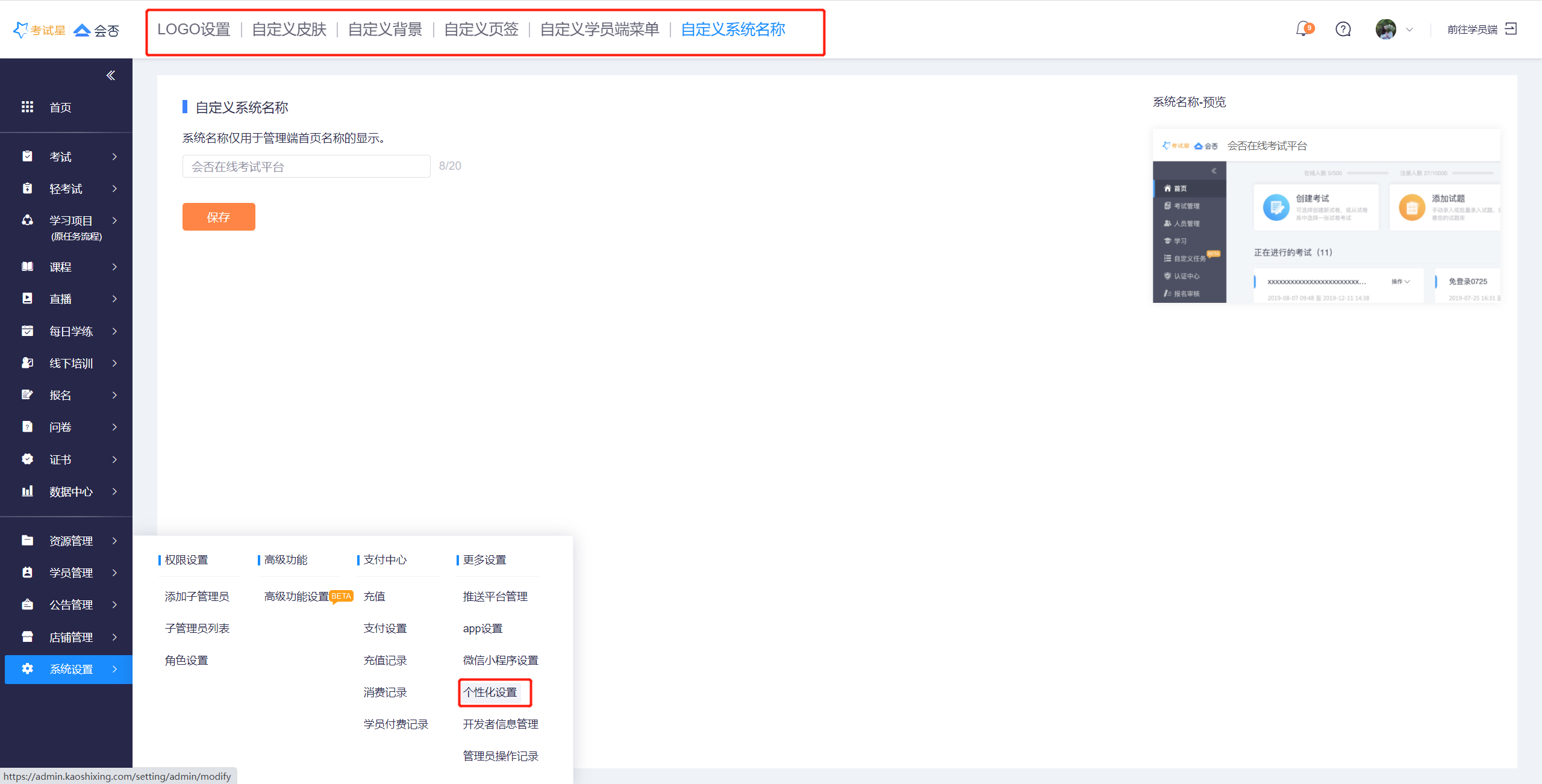 **自定义系统名称**:系统名称用于管理端首页名称的显示,最多不可超过20个字,如不设置将默认显示为“考试星在线考试系统”;