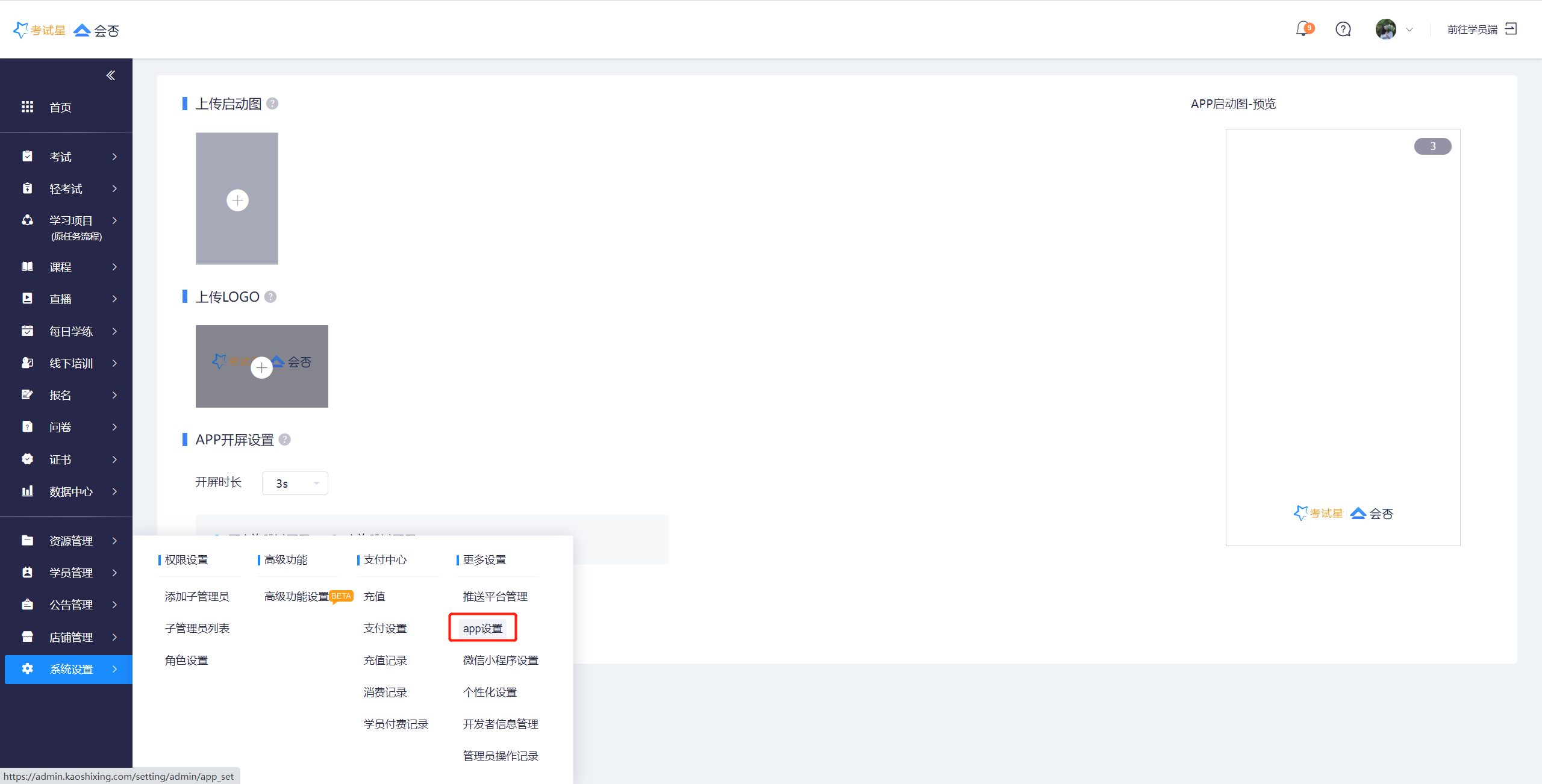 APP开屏设置:APP开屏设置仅支持0-10秒时长,倒计时结束后将自动进入APP,如不需要此功能庆设置0秒,也可设置是否允许学员点击跳过开屏;