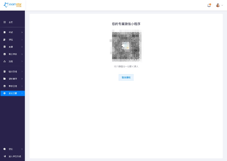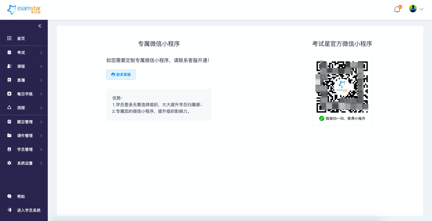 专属小程序审核通过后,前往考试星管理后台,进入【系统设置】->【微信小程序设置】,此页上将显示您的“专属小程序码“,学员扫描此二维码即可进入您的专属小程序。