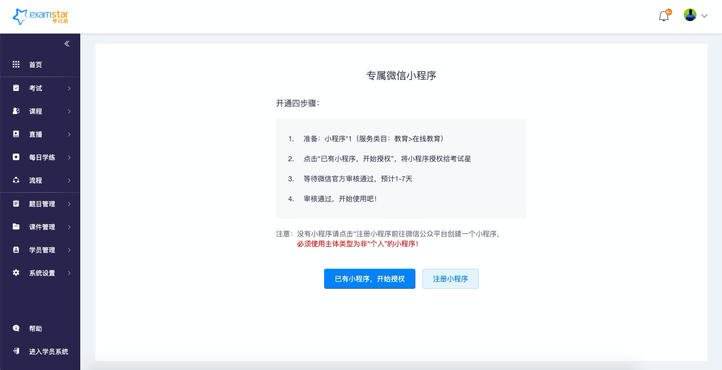 首先您得具备1个微信小程序,将此微信小程序授权给考试星,然后考试星官方将会以开发者角色为您管理此小程序。