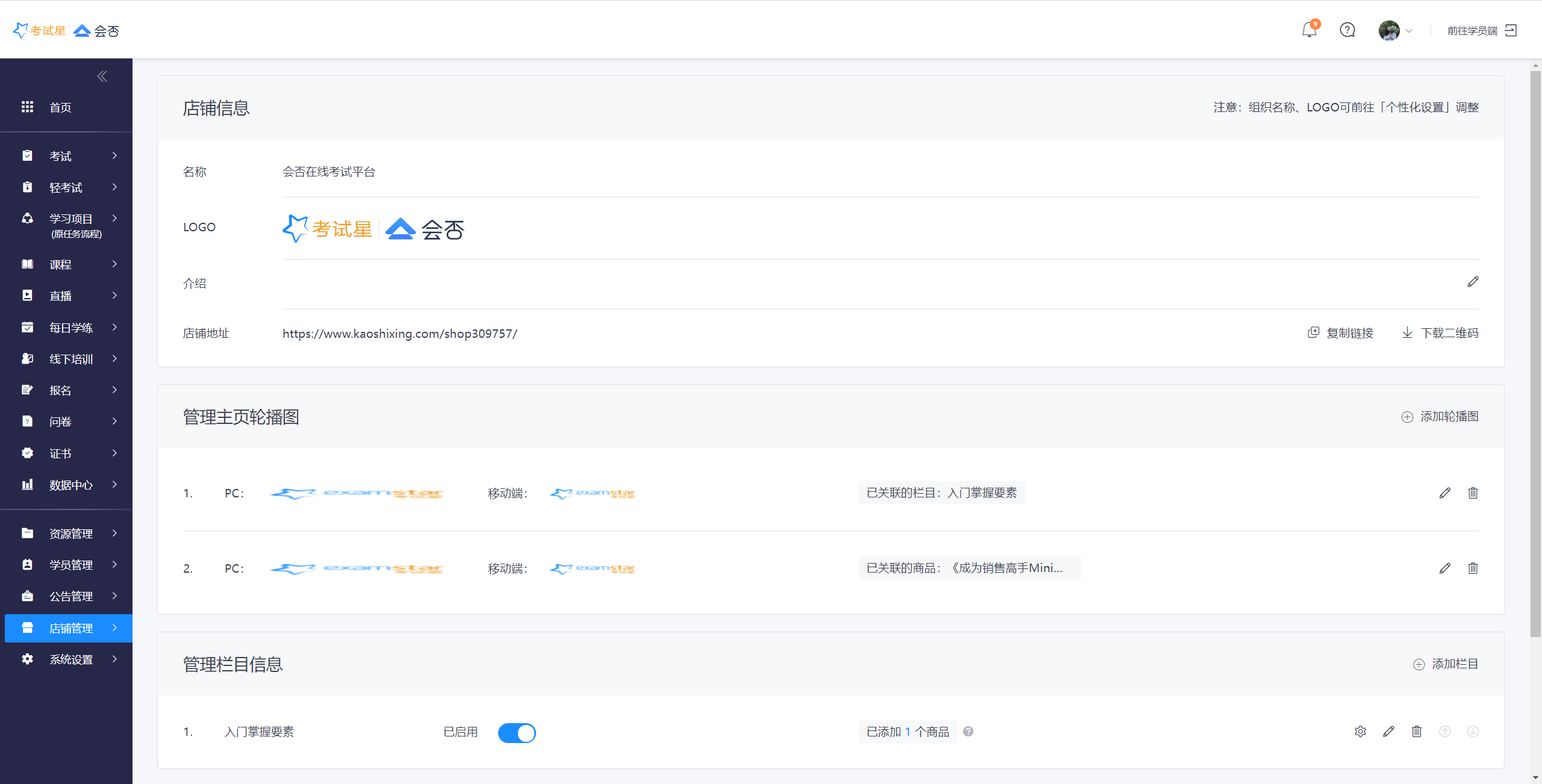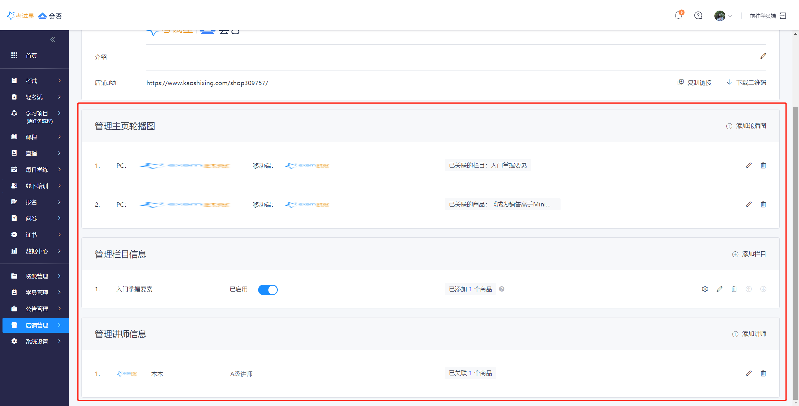 ## 15.1 **主页管理**(知识店铺用于对外展示,学员无需登录即可见商品)