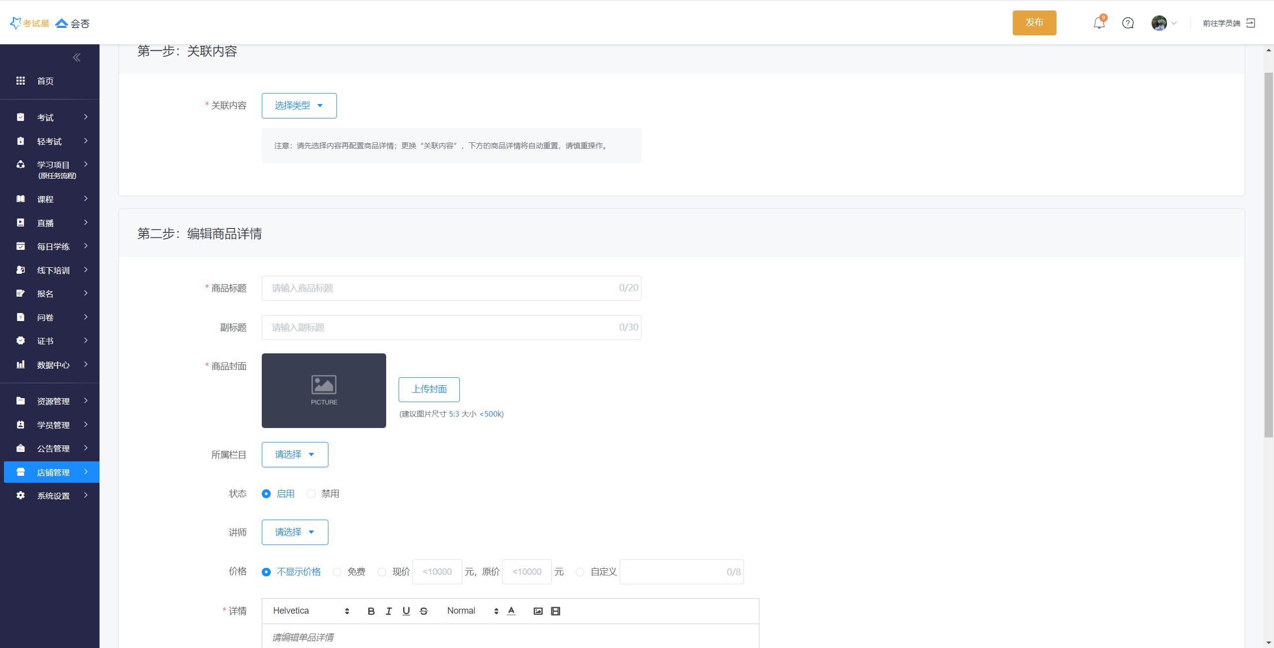 1.**关联内容**:选择考试、课程、直播等内容,作为商品基础;(需注意,关联自定义任务的内容无法用于创建商品)