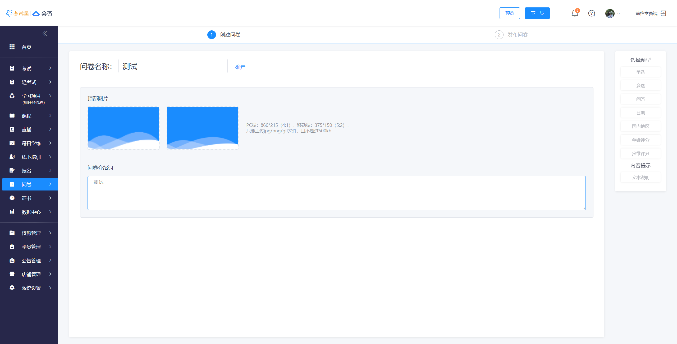 管理端左侧导航菜单中,点击创建问卷,即可进入创建问卷流程