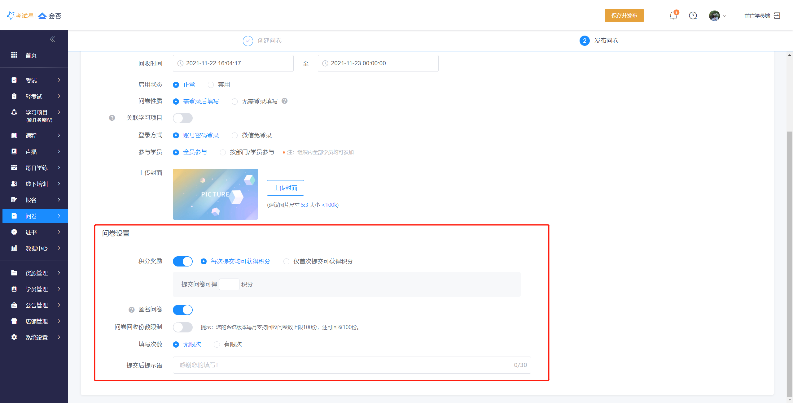 》积分奖励:可设置学员每次提交问卷均可获得积分,或仅首次提交可获得积分