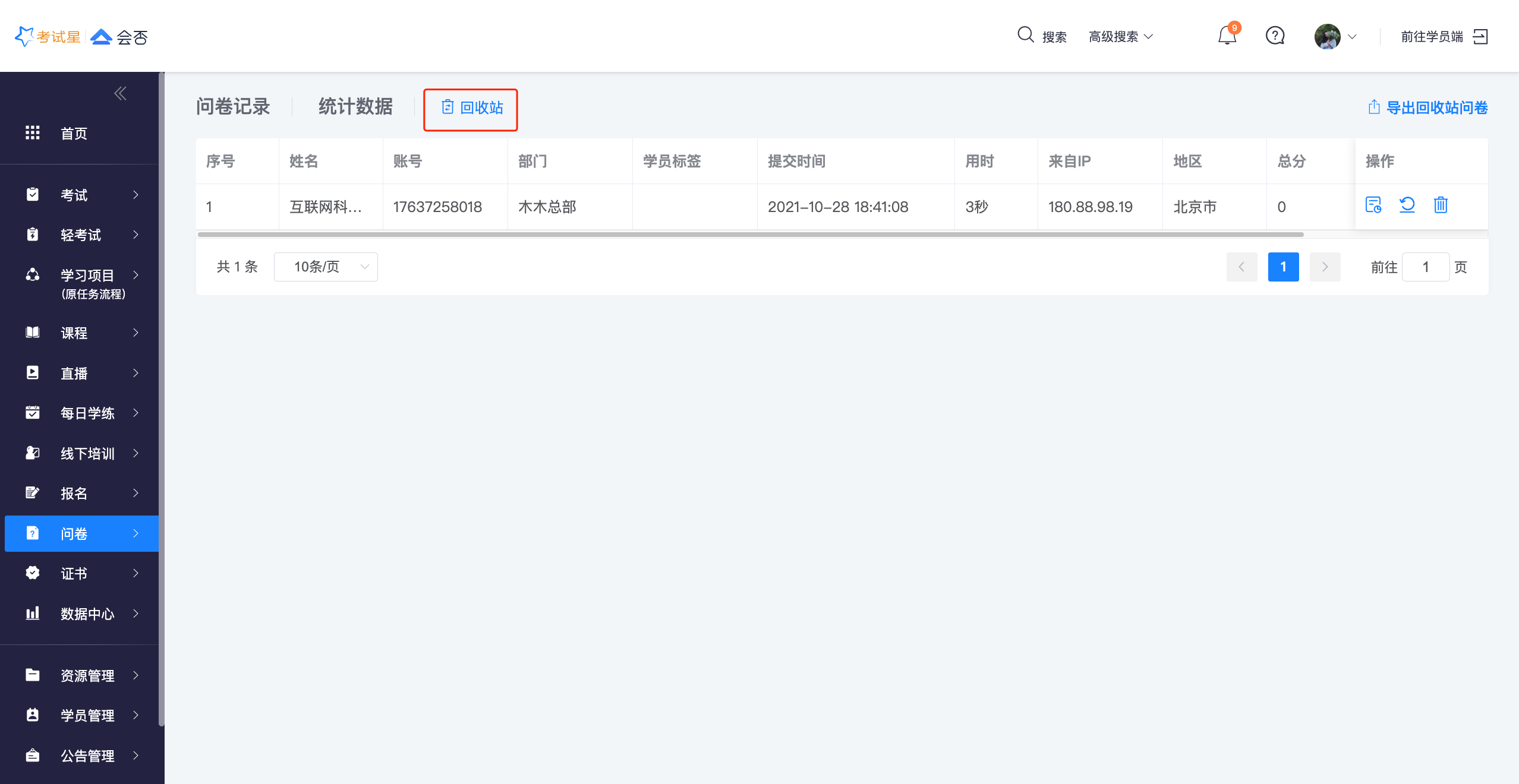 问卷记录中,所有被移入回收站的问卷都将存放于回收站