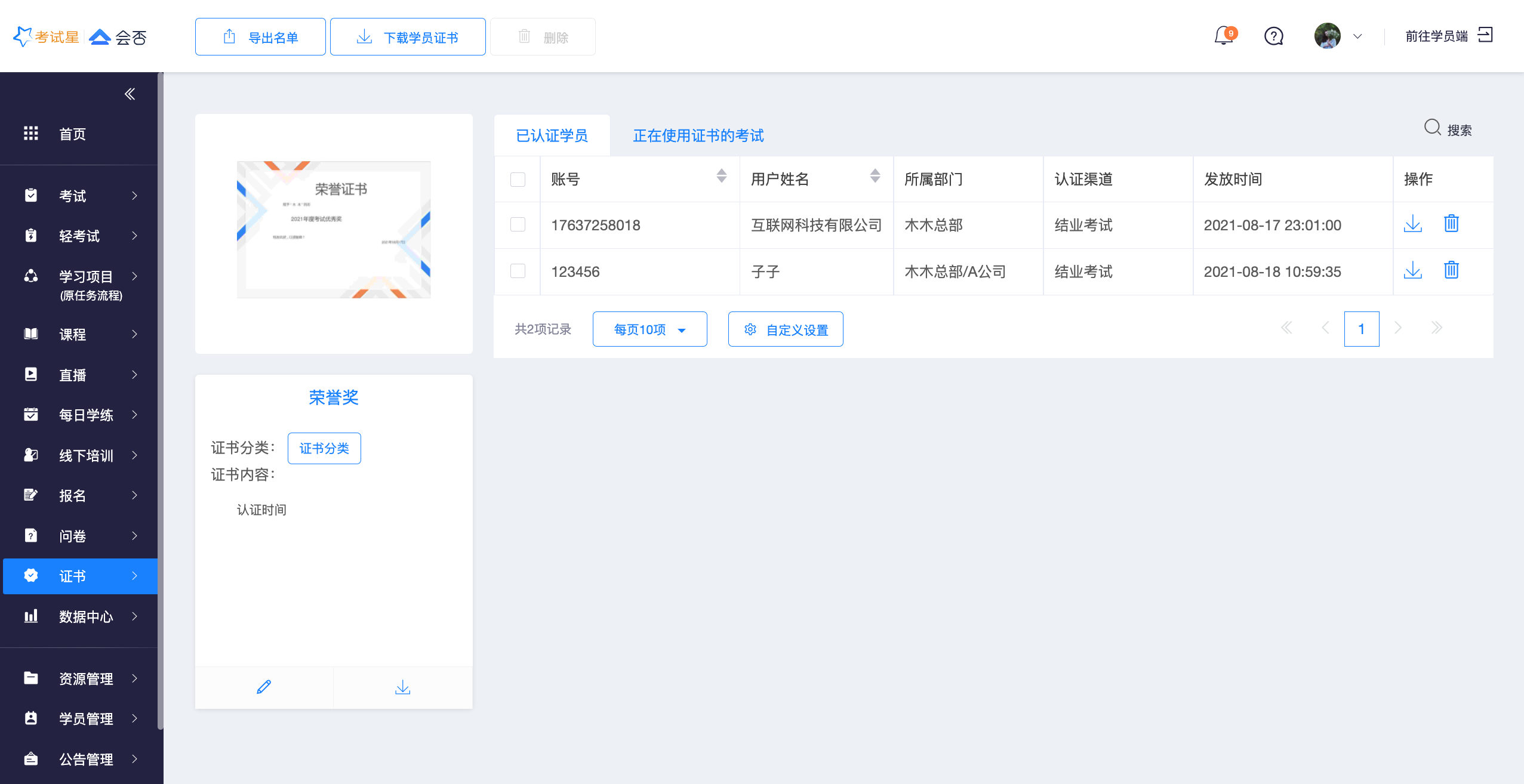 * 证书管理中“已认证学员“名单为全部获得此证书的学员,即使此证书关联多场考试