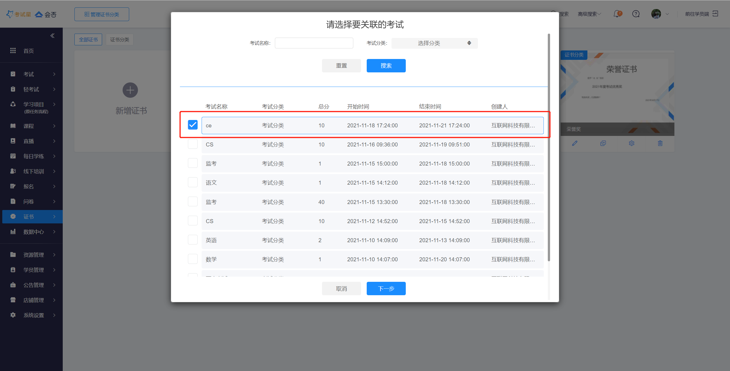 * 发放设置:证书列表找到具体某一张证书,进入证书管理,找到“正在使用证书的考试“,可在此列表右侧找到“关联考试“按钮,点击关联考试,即可选择考试进行关联;