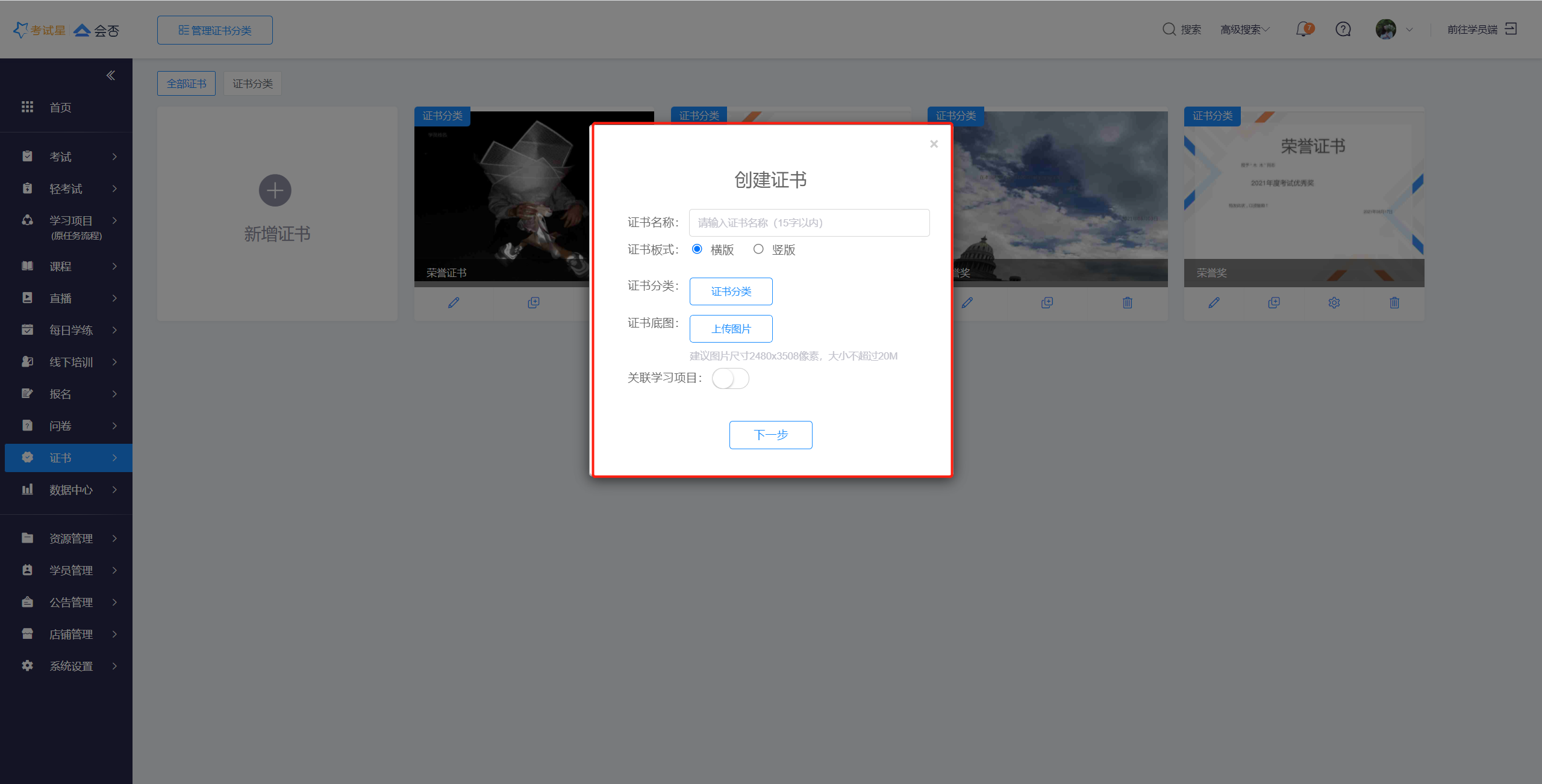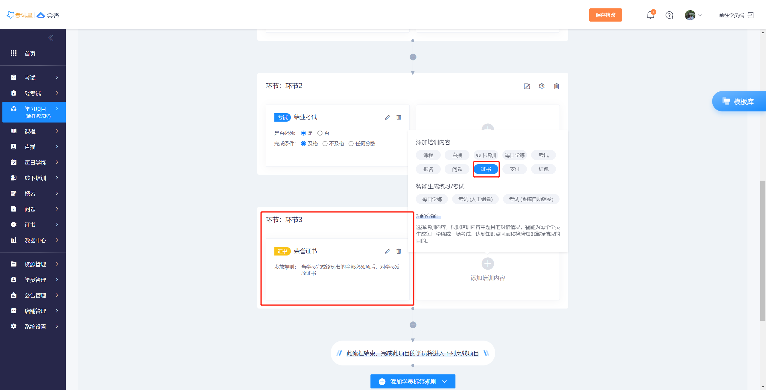 * 自定义任务(学习地图)中,进入到证书环节的学员将得到证书