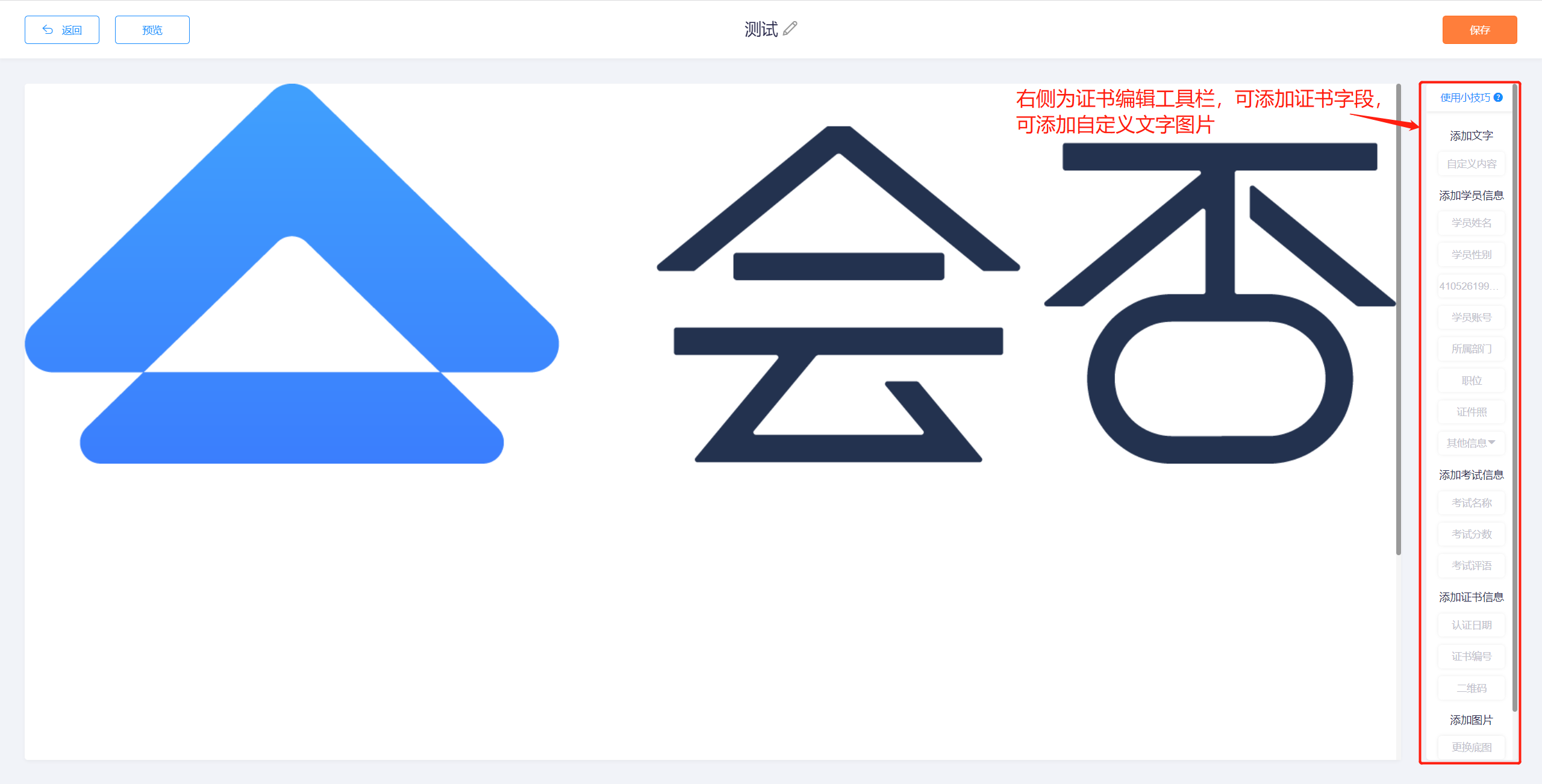* 学员信息:如果证书上需要放一些学员信息,可在此选择,生成证书时对应的信息会替换为学员实际的个人信息,例如姓名、性别等