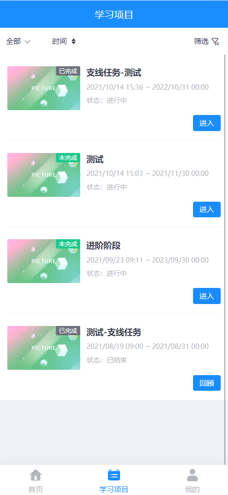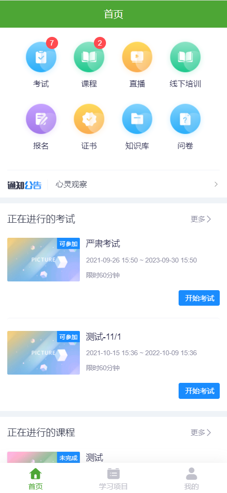 “考试”,可查看当前登录账号可参加的考试、全部参与过的考试,收藏的试题和错题本;