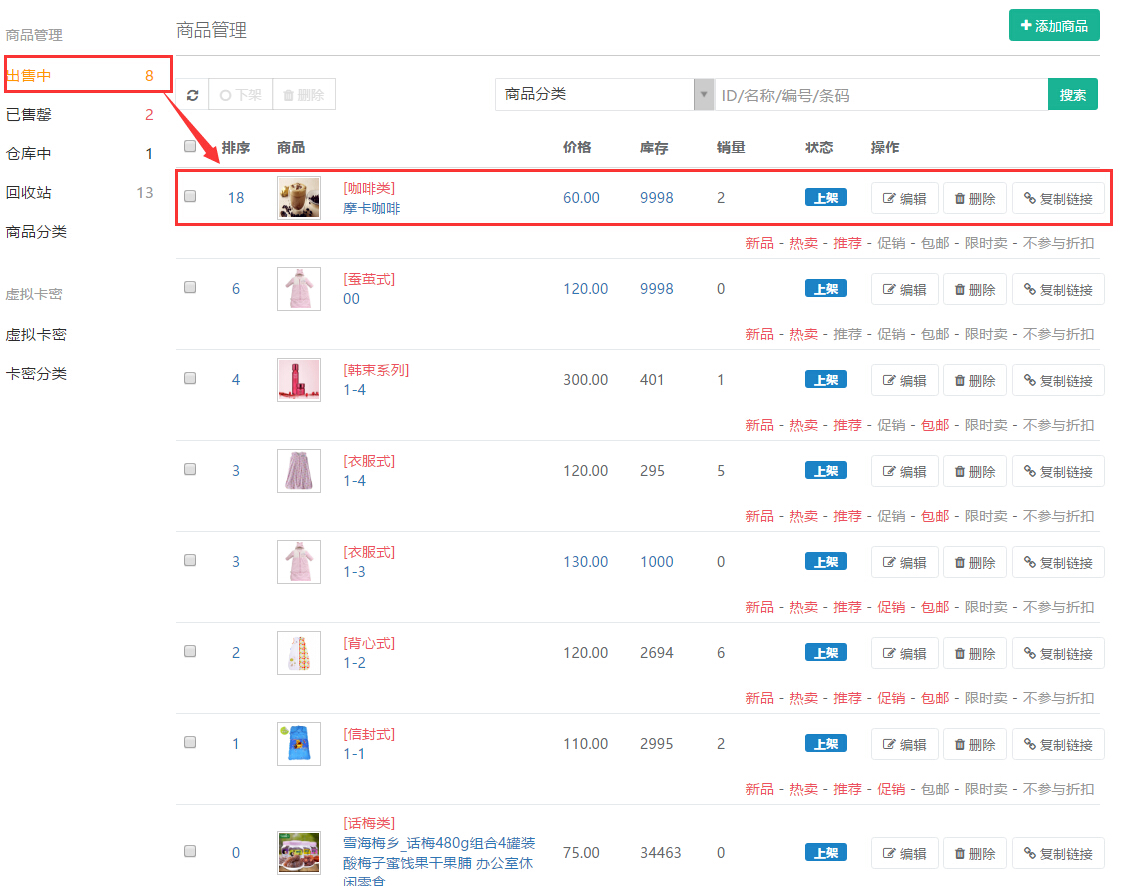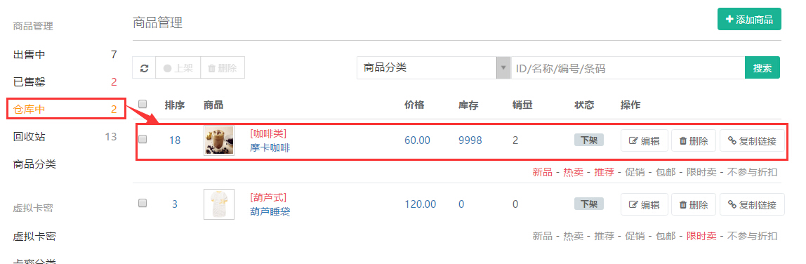 未填写库存,则上架或下架的商品在”已售罄“中列示,同时下架的商品也在”仓库中“列示,参见下图: