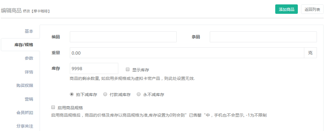 根据商城需求选择减库存方式,点击“启用商品规格”后,以上信息无法填写,且商品的价格及库存以商品规格为准,库存设置为0则会到”已售罄“中,手机也不会显示,-1为不限制,参见下图: