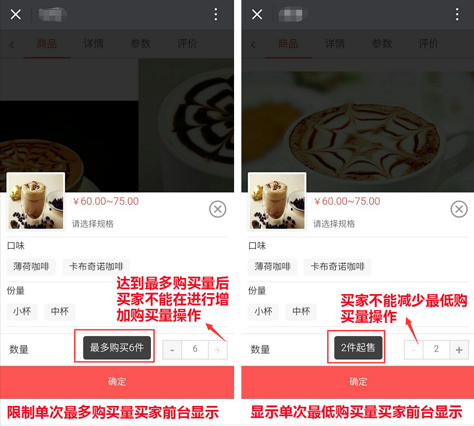 如上图所示设置的商品购买权限,买家单次最多购买此商品6个,最低2个,买家购买或加入购物车时,则会提示,参见下图: