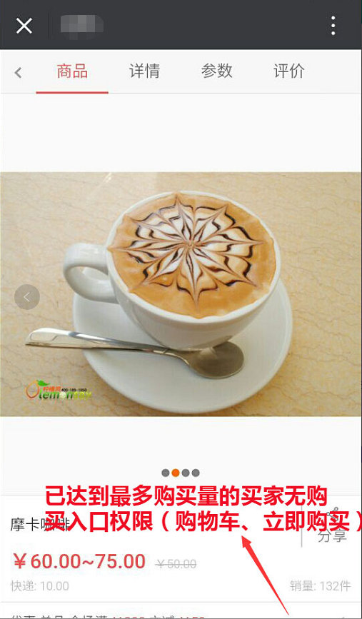 买家达到已设置的最多购买量(之前购买的与之后购买的和)后,则没有权限在购买此商品,参见下图: