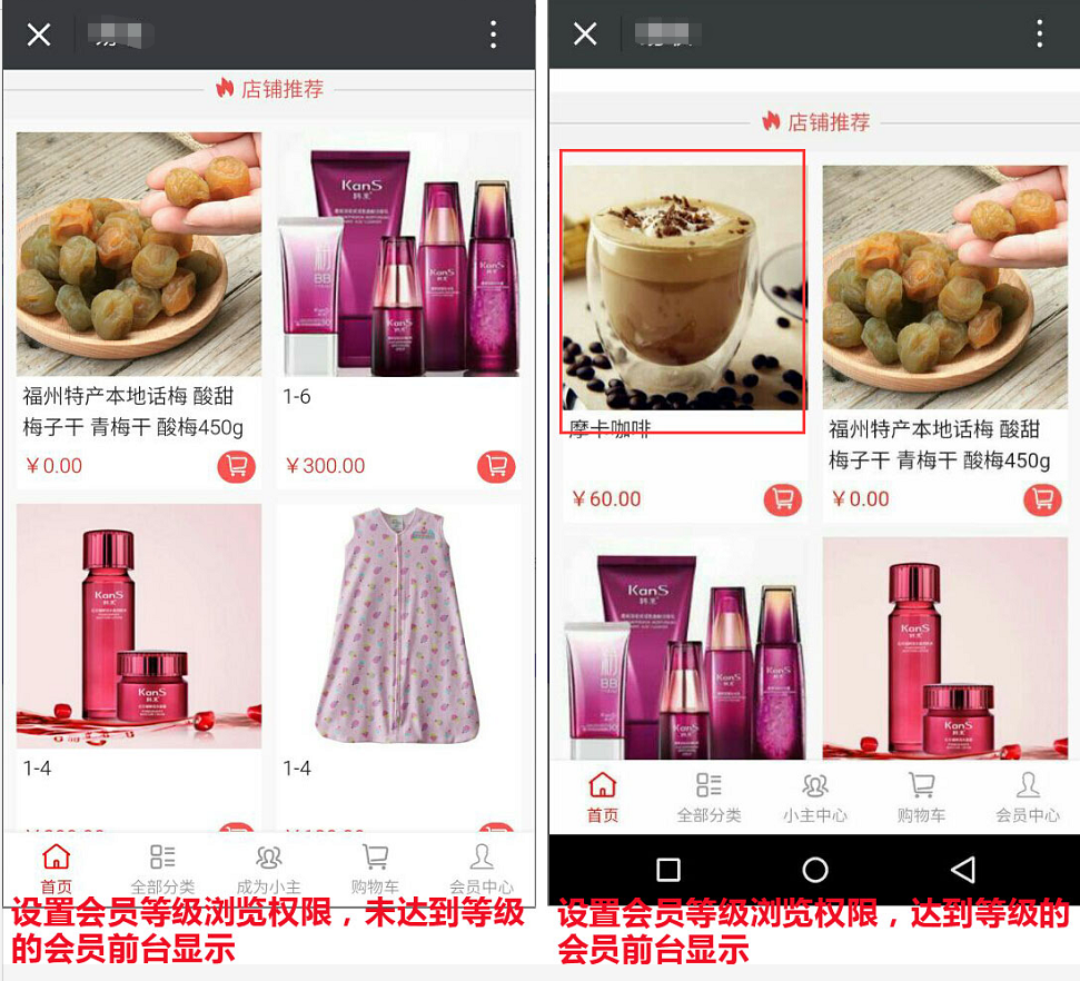 设置选择会员等级/分组浏览权限后,买家在商城中达不到的会员等级或不在设置的会员分组内,则就会看不到此商品,参见下图: