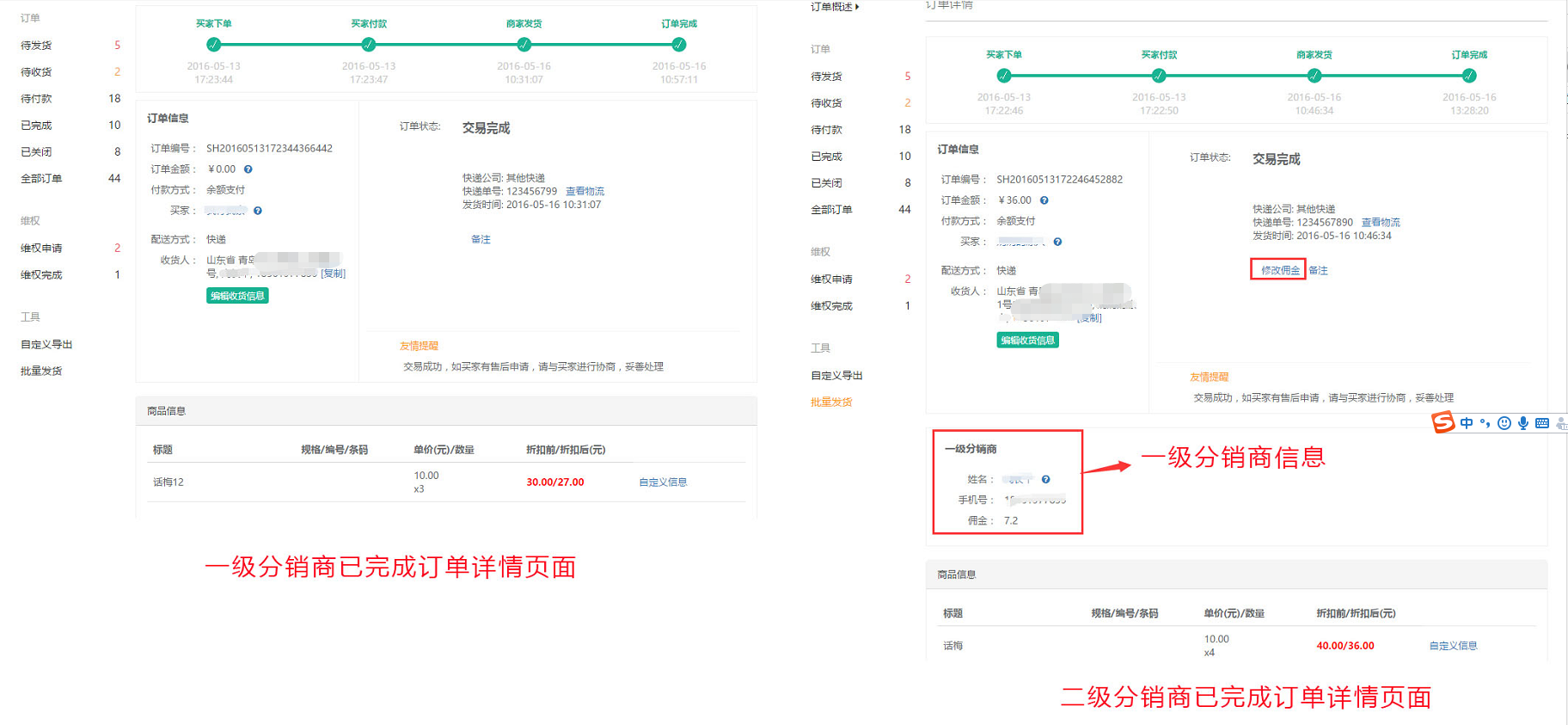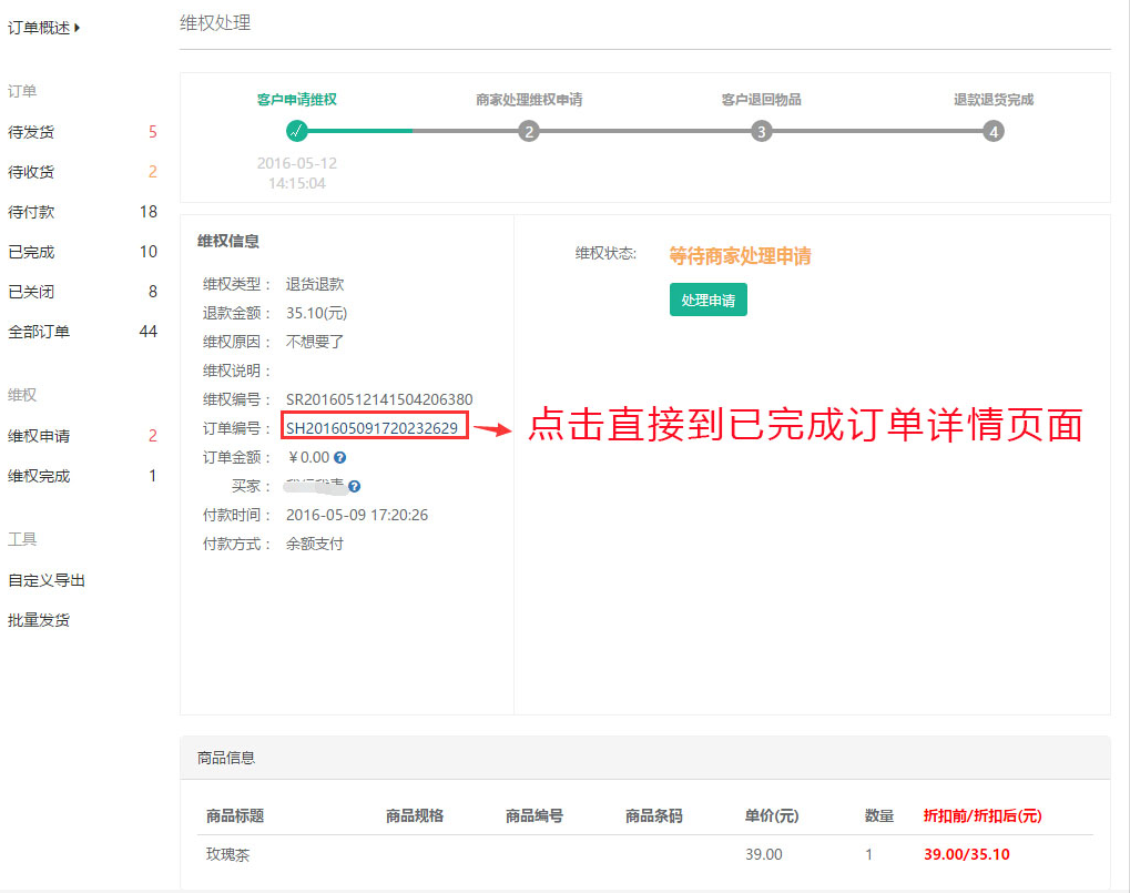 买家已确认收货后的订单信息以及买家确认收货后申请退货或换货等维权信息的查看和处理等信息在“已完成”中列示统计,不同已完成的订单进行相应的订单处理操作,参见下图: