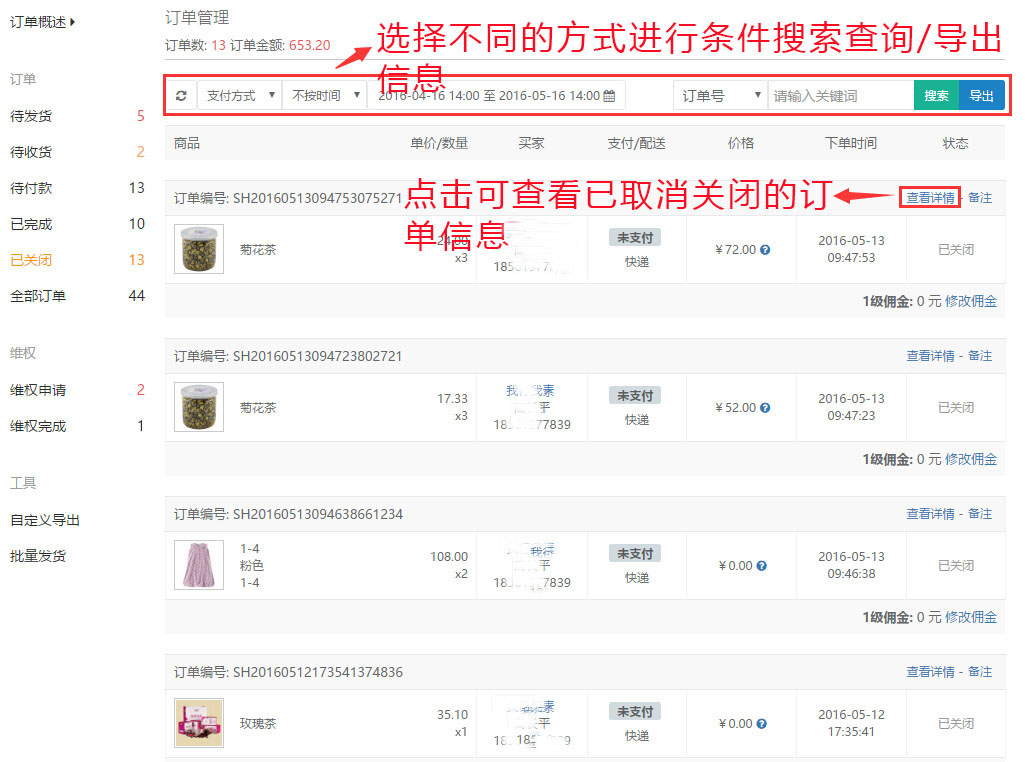 买家提交订单到限定支付日期未支付自动关闭的订单,买家取消的订单,订单未付款超过规定期限后等的订单信息都在此功能下进行列示统计,可查看订单的详情**(一级分销商与二级分销商的订单详情不同)**,参见下图: