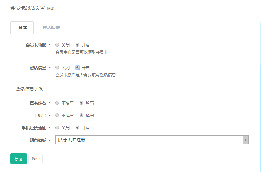 * **激活信息字段:**可以自定义选择是否填写真实姓名,是否填写手机号,如果手机号选择了不填写,则下面的手机短信验证,短信模板就不需要选择开启,如果选择了填写手机号,开启手机短信验证,则必须要选择短信模板,否则用户将无法收到验证码短信以完成激活流程。