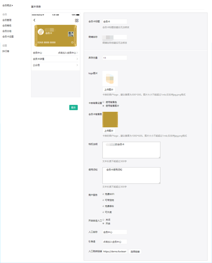 * **会员卡标题:**支持自定义设置,创建后无法修改,长度不能超过15个字符,如果输入非法字符会被强制转义。